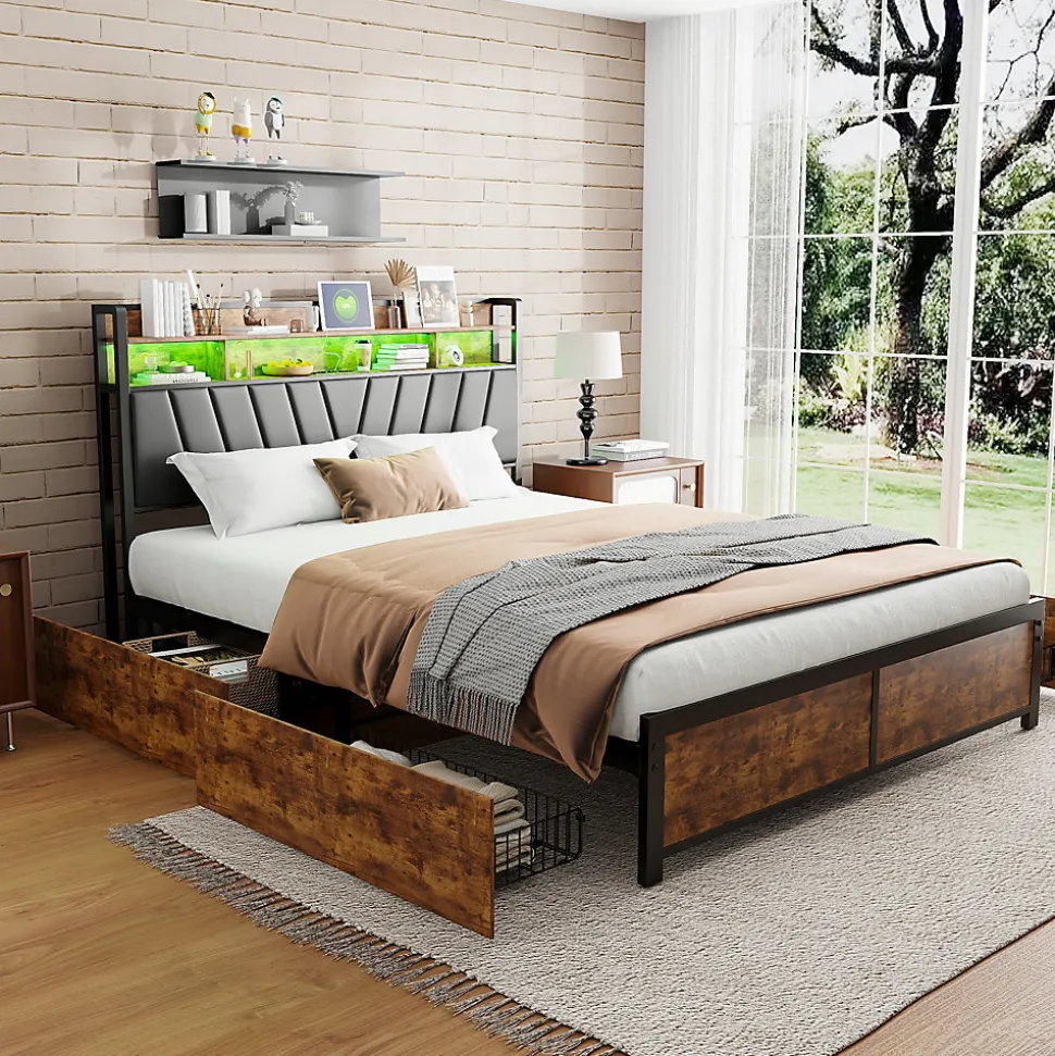 ✦Description du produit1. Éclairage LED intelligent et multicoloreLa bande LED intégrée se contrôle par télécommande ou application, avec plusieurs modes de couleurs. Les fonctions de synchronisation musicale et de minuterie créent une ambiance personnalisée dans la chambre.2. Chargement pratique intégréLa tête de lit dispose de deux ports USB et de deux prises aux normes européennes, idéales pour recharger téléphones, tablettes et petits appareils électroniques.3. Rangement spacieux et fonctionnelQuatre tiroirs de grande capacité, deux de chaque côté du lit, permettent de ranger vêtements, literie et objets du quotidien, optimisant l’espace de la chambre.4. Tête de lit à double compartimentLa conception à double niveau permet de poser livres, réveils ou décorations, alliant esthétique moderne et praticité.5. Structure robuste en acier et boisLe cadre en acier et bois de qualité assure stabilité, durabilité et soutien fiable pour un confort de sommeil optimal.✦Spécifications du produit :- Matériel: bois d’acier + MDF + métal- Dimensions (LxPxH) : 217 x 160 x 112,5 cm- Matelas applicable : 160 x 200 cm- Épaisseur du matelas adaptée : 25 cm – Charge maximale : 300 kg- Couleur : noir, Brown- Distance tête de lit : 25 cm- LED et USB : Oui- Nombre de colis : 2✦ Remarque : ※ Ce produit est livré en 2 colis, qui peuvent arriver séparément. Merci de votre patience.※ Une erreur de mesure de 2 à 3 cm peut survenir en raison des mesures manuelles.※ Des différences de couleur peuvent apparaître en raison de l’éclairage. Veuillez vous référer au produit réellement reçu.※ Si vous avez des questions lors de l’installation, veuillez nous contacter dès que possible.