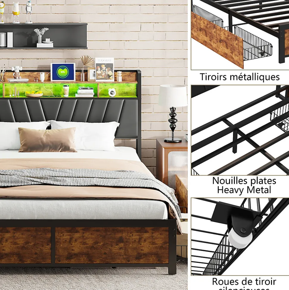 Cadre de Lit Double 160×200 cm avec Tiroirs Coulissants et LED, en Métal Noir et Bois, Parfait pour Chambre d’Adultes, USB, noir