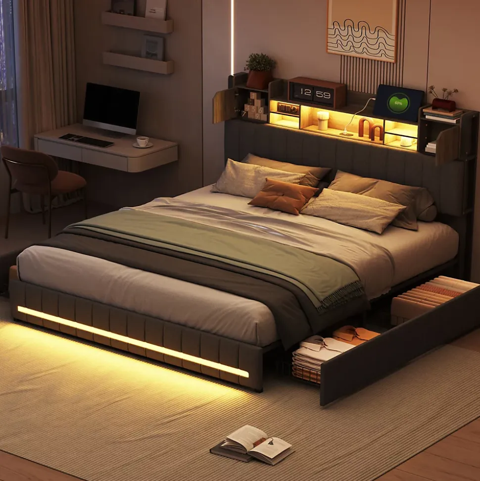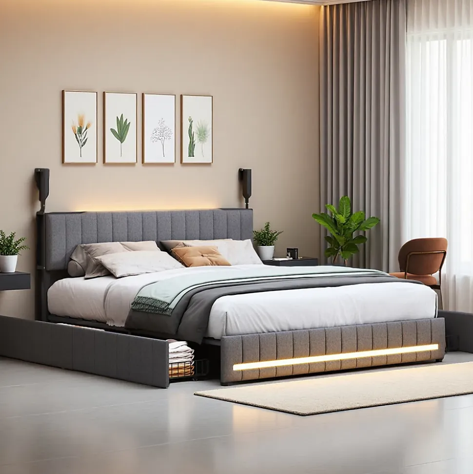 Cadre de lit double gris 140x190 cm, sommier à lattes, rembourré avec tête de lit rangement, 4 tiroirs intégrés et montage facile