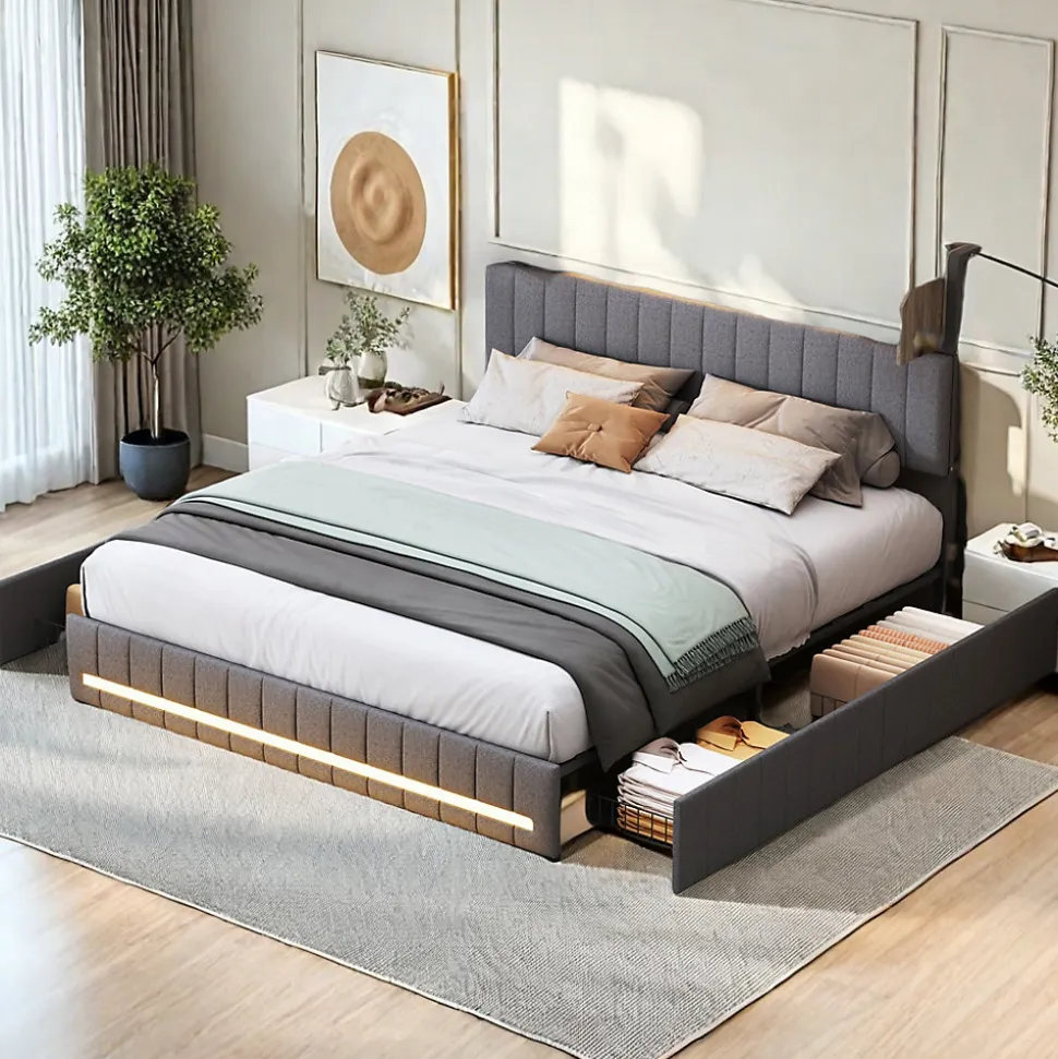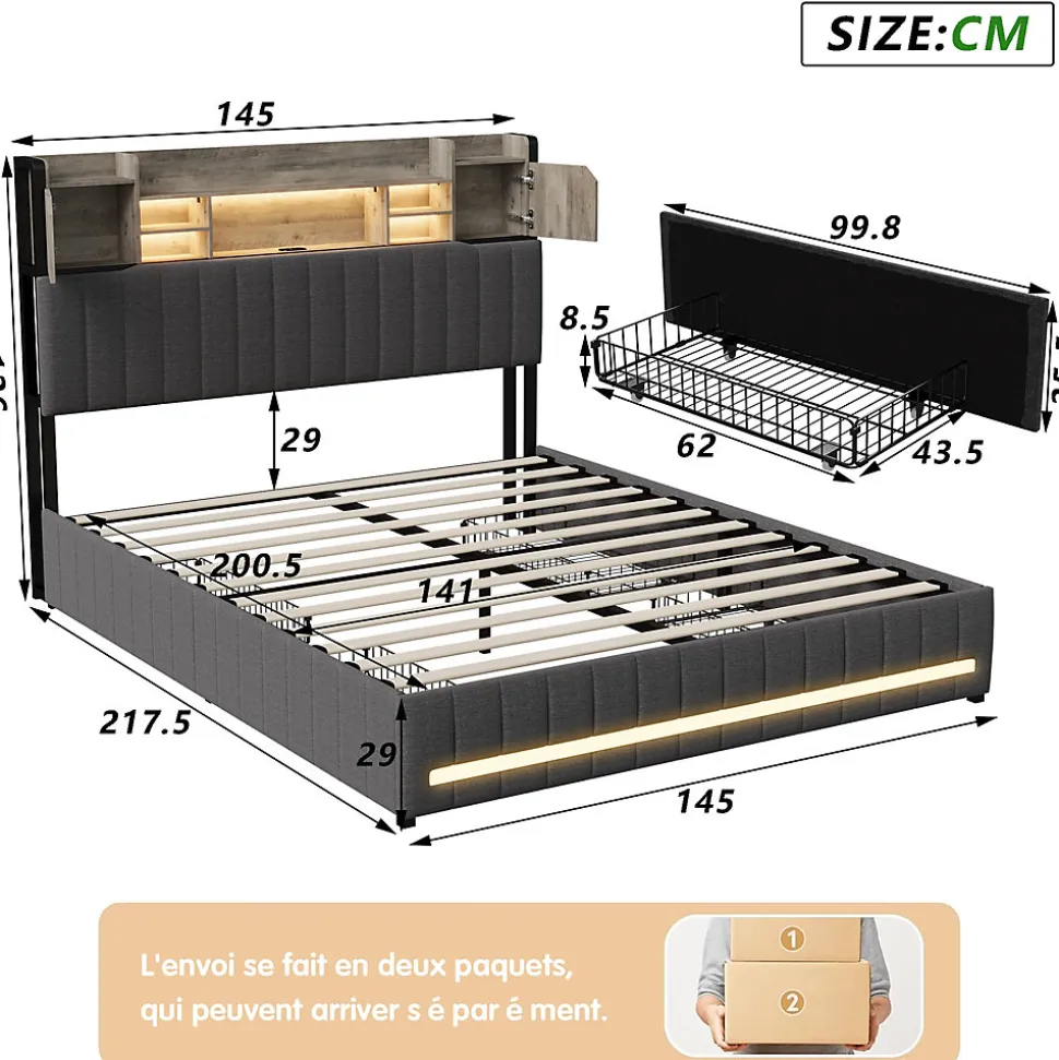 Cadre de lit double spacieux et pratique : ce cadre de lit de 140 x 200 cm est spécialement conçu pour les matelas doubles et offre un confort exceptionnel pour deux personnes. Il dispose d’un sommier à lattes intégré qui garantit un support stable et ferme pour un bon sommeil. Avec ses dimensions généreuses, ce lit est idéal pour la chambre à coucher et apportera une touche moderne à votre intérieur. Lit double rembourré avec espace de rangement intégré. Ce lit double rembourré dispose de quatre tiroirs spacieux qui allient élégance et fonctionnalité. Ces tiroirs offrent une solution de rangement idéale sans affecter votre espace de vie. Que ce soit pour les couvertures, les oreillers ou les vêtements, le lit avec tiroirs offre une solution pratique pour garder votre chambre bien rangée tout en conservant une esthétique raffinée. Tête de lit avec espace de rangement : la tête de lit avec espace de rangement intégré est un ajout précieux à ce lit et peut contenir des livres, des télécommandes ou d’autres petits objets importants. Il met non seulement en valeur l’apparence du lit, mais offre également un espace supplémentaire pour garder votre chambre bien rangée. Ce lit avec tête de lit est idéal pour une organisation efficace et un gain de place. Montage facile : ce lit pour adulte de 140 x 200 cm dispose d’un système de montage simple pour une installation rapide, ce qui le rend parfait pour tous ceux qui ont peu de temps ou pas d’expérience dans le bricolage. Sa finition grise s’adapte à tous les styles de décoration, moderne ou traditionnel, et constitue un meuble moderne, fonctionnel et visuellement attrayant pour votre chambre à coucher. Remarque : Ce lit ne comprend pas de matelas. Matelas adapté : 140 x 200 cm. En raison des dimensions plus grandes du cadre de lit double, l’article est expédié dans deux paquets séparés pour assurer une livraison sûre.