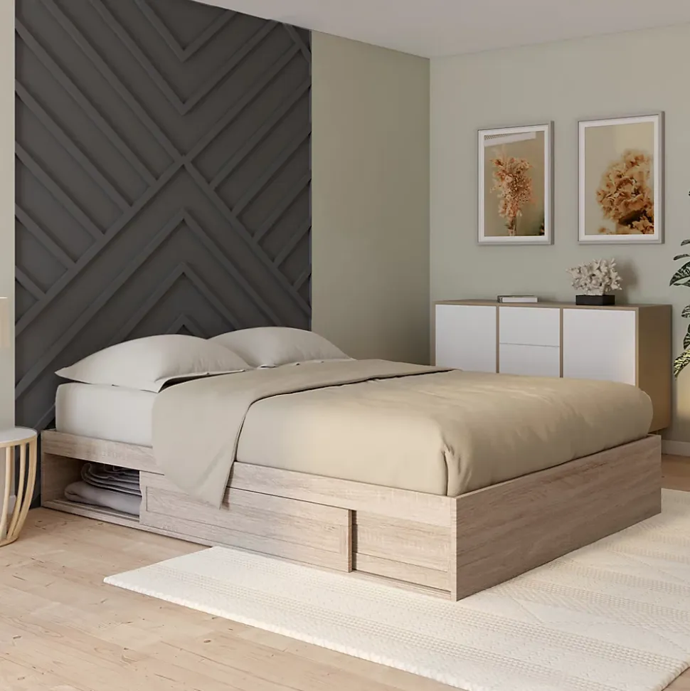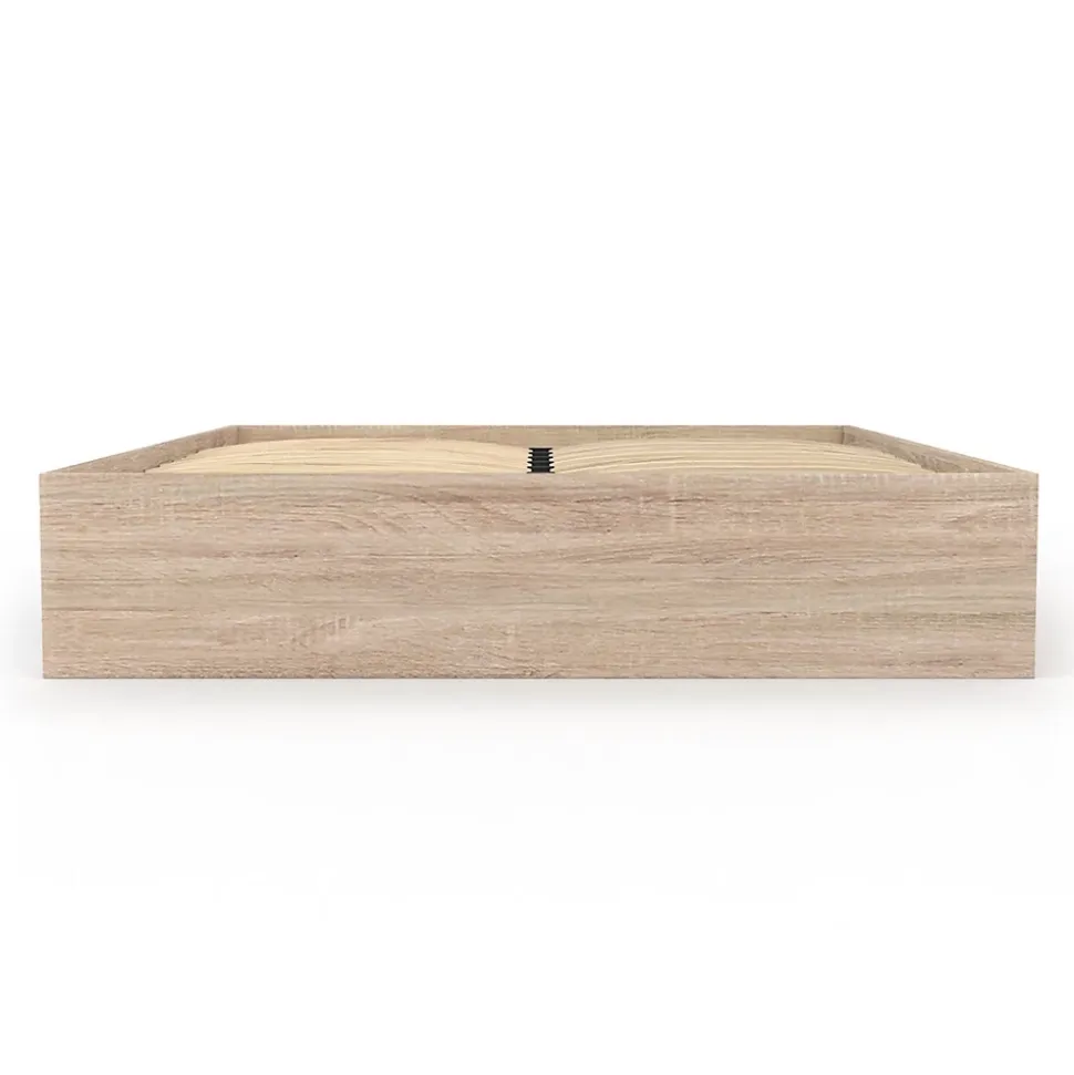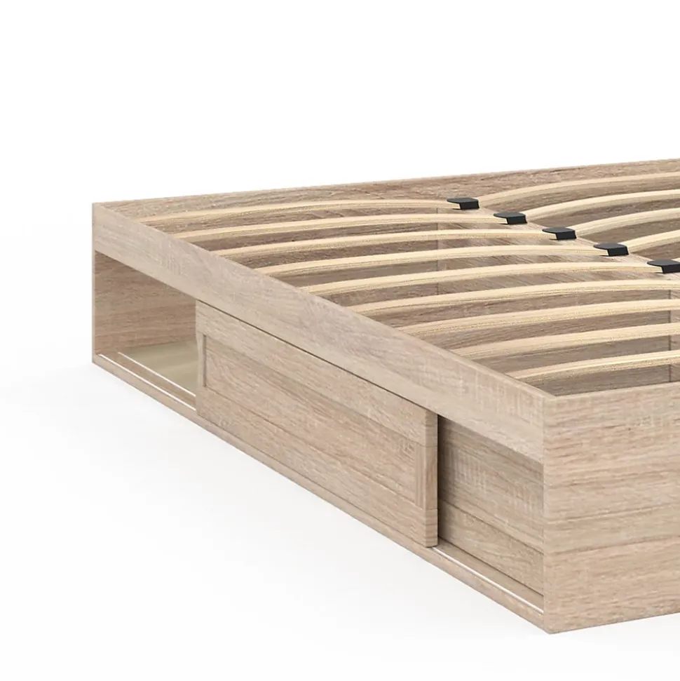 Gagnez de la place de façon astucieuse avec ce cadre de lit SALEM coloris bois 140 x 190 cm. Équipé de deux larges compartiments spacieux intégrés sous le sommier de 95 x 72,5 x 23 cm, ce cadre de lit vous permettra de ranger couettes, couvertures et pourquoi pas vos vêtements de la saison suivante. Idéale pour les petits espaces, l’ouverture se fait à l’aide de portes coulissantes. Ce cadre de lit avec rangement s’intégrera parfaitement à votre intérieur grâce à la pureté de ses lignes ainsi qu’à sa couleur épurée effet bois et apportera une touche de luminosité à votre chambre à coucher.Sa taille de 140 x 190 cm conviendra parfaitement pour un matelas standard double. De plus, son sommier, composé de 20 lattes, vous offrira un soutien optimal pour votre matelas et un meilleur confort pendant votre sommeil.À la fois pratique et esthétique, ce cadre de lit en panneaux de particules de bois saura trouver sa place dans votre chambre à coucher ou dans une chambre d’amis. N’attendez plus et optez pour ce cadre de lit SALEM avec ses rangements et son sommier 140 x 190 cm inclus ! Dimensions du cadre de lit SALEM 140×190 cm coloris boisDimensions globales : Longueur 195 cm x largeur 145 cm x Hauteur 30 cmDimensions intérieures d’un rangement : L. 95 x l. 72,5 x H. 23 cmHauteur des portes coulissantes : 17,5 cmMatériaux : panneaux de particules de bois (PB)Couleur : hêtreSommier 20 lattes inclus À monter soi-même Ce cadre de lit SALEM est également disponible en blanc et bois et blanc.Retrouvez l’ensemble de notre gamme de lits sur notre boutique en ligne !