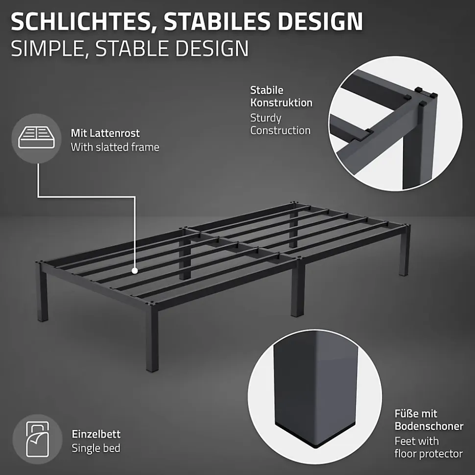 Le cadre de lit élégant de ML-Design est idéal pour votre chambre à coucher. Le design moderne s’adapte très bien à tout intérieur déjà existant. Grâce à sa finition de haute qualité, la construction est très robuste et durable. Les lattes pratiques offrent la stabilité nécessaire et sont très confortables.Le cadre de lit est très facile à monter et à entretenir. Le sommier à lattes fourni est également facile et rapide à monter. Commandez donc dès maintenant ce magnifique lit de ML-Design pour pouvoir dormir tranquillement la nuit.Caractéristiques du litDesign moderneFacile à monterGrand confort de couchageSommier à lattes fourniPieds avec protections de solConstruction robusteCadre de lit élégant de ML-Design Caractéristiques du matelasConvient aux personnes allergiquesParfait pour le lit de votre enfantMousse froide de haute qualitéPositionnement sain des parties du corpsSoutien optimal quelle que soit la position de sommeilLa housse extérieure est piquée par ultrasons, sans fils, pour retarder la pénétration des liquides.RespirantRésistant à l’usureDesign moderne Livraison1x Cadre de lit avec sommier à lattes1x Matériel de montage1x Matelas en mousse froide Information technique:LitMatériau du cadre et du sommier: cadre en acier, revêtu par poudreCouleur: anthraciteDimensions (LxlxH): environ 200 x 90 x 31 cmDimensions de la surface de couchage (Lxl): environ 200 x 90 cmDimensions des lattes (LxH): environ 2 x 2 cmDimensions des pieds (LxlxH): 4 x 4 x 31 cmDimensions du cadre (LxH): environ 2 x 4 cmPoids: environ 10,9 kgCapacité max. de charge: 150 kg MatelasMatériau de la housse: 100% polyesterMatériau: mousse froideDimensions (LxlxH): environ 200 x 90 x 10 cmDensité: 23kg/m³Dureté: 4,2 kPaAllergique: convientHousse amovible: ouiCertification: Oeko-Tex Standard 100Poids: environ 6,7 kg