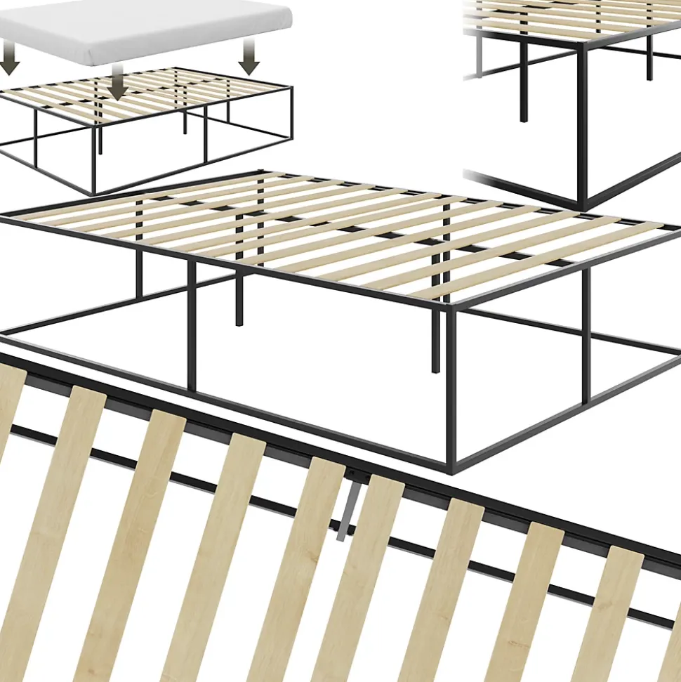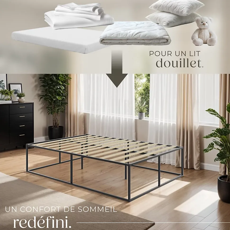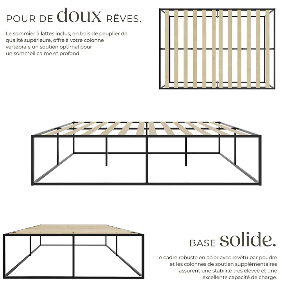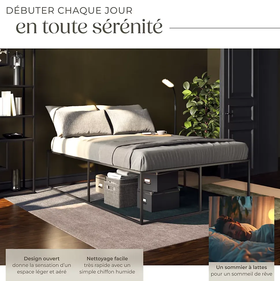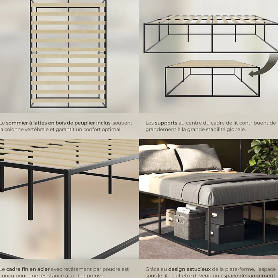 - Points Forts:Lit en métal avec une capacité de charge élevée dans un style minimalisteInclus un sommier à lattes en bois de peuplier pour un soutien optimal de la colonne vertébraleStyle plateforme astucieux pour un espace de rangement pratique sous le litStructure en acier solide avec une protection laqué époxyEmbouts en plastique antidérapants pour une grande stabilitéMontage rapide