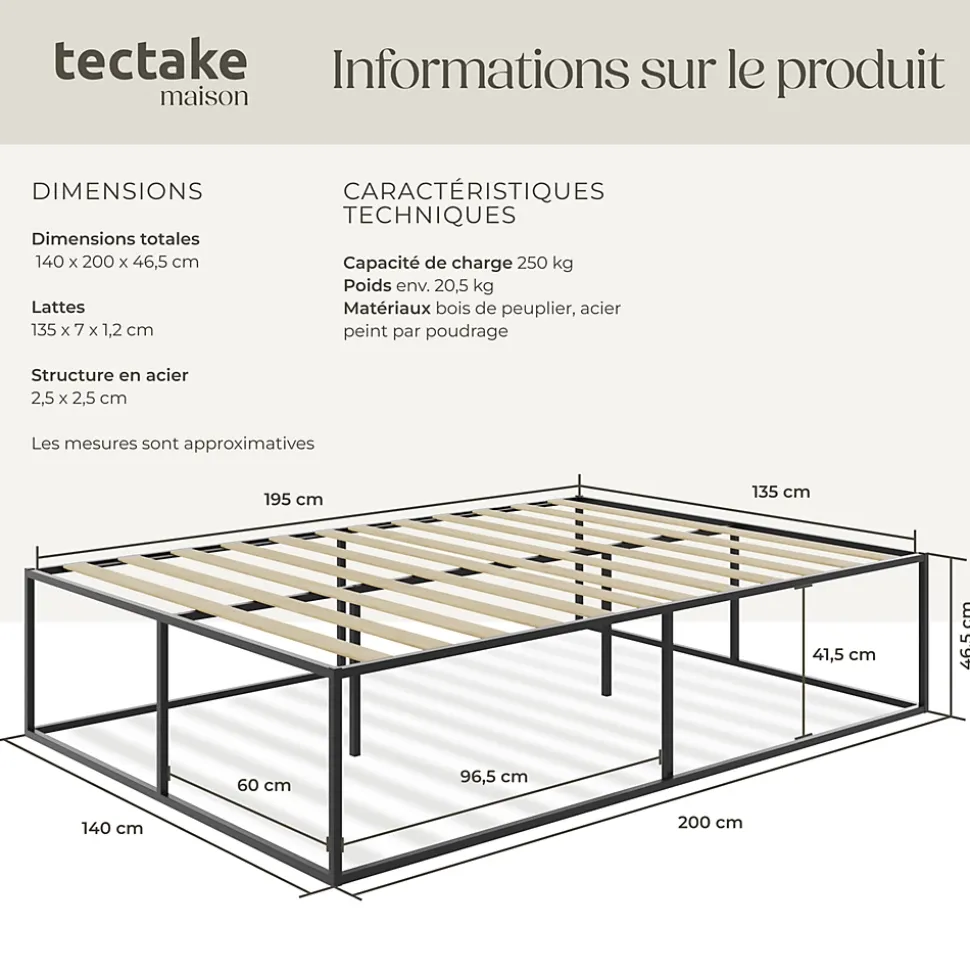 Cadre de lit en métal KYOTO – design minimaliste allié à une fonctionnalité maximaleLe cadre de lit KYOTO de tectake apporte une touche moderne à votre chambre et assure des rêves doux. Avec ses lignes épurées et son style discret, il crée une atmosphère calme et harmonieuse et s’intègre parfaitement dans différents styles d’aménagement.Cadre plateforme pour plus d’ordre dans la chambreL’un des traits remarquables du lit en métal KYOTO est le design astucieux de la plateforme qui vous offre un espace de rangement supplémentaire sous la surface de couchage. Vous pouvez y ranger par exemple du linge de lit, des coussins ou des vêtements saisonniers dans des tiroirs sous le lit ou des boîtes. Le nettoyage du sol nécessaire en raison de la poussière qui s’accumule inévitablement sous un lit, devient ainsi très facile.Inclus sommier à lattes pour un confort de sommeil optimalUn sommeil réparateur commence par un bon soutien. Ce lit en métal est livré avec un sommier à lattes de haute qualité en bois de peuplier. Le sommier s’intègre parfaitement dans le cadre du lit et offre, avec le cadre solide, un support ferme pour votre matelas.Cadre en métal massif pour une excellente stabilitéGrâce à son cadre en métal robuste avec une finition laqué époxy durable, le lit est non seulement très résistant mais aussi facile d’entretien. Les embouts en plastique doux pour le sol garantissent également une position stable et protègent votre sol des rayures.Montage facile – prêt à l’emploi en quelques minutesL’assemblage est très simple et peut être effectué en un rien de temps sans compétence spécifique en bricolage ni outils vous permettant ainsi de profiter rapidement de votre nouvel espace de repos. Avec le lit métallique KYOTO de tectake rien ne s’oppose plus à votre sommeil réparateur.