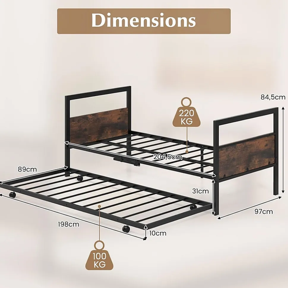 Matériau : Bois d’ingénierie, métalDimensions hors tout : 204,5 x 97 x 84,5 cm (L x l x H)Dimensions du lit gigogne : 198 x 89 x 10 cm (L x l x H)Capacité de poids du lit de repos : 220 kgCapacité de poids du lit gigogne : 100 kgPoids net : 30 kgLivraisons :1 x cadre de lit simple en métal avec lit gigogne1 x manuel