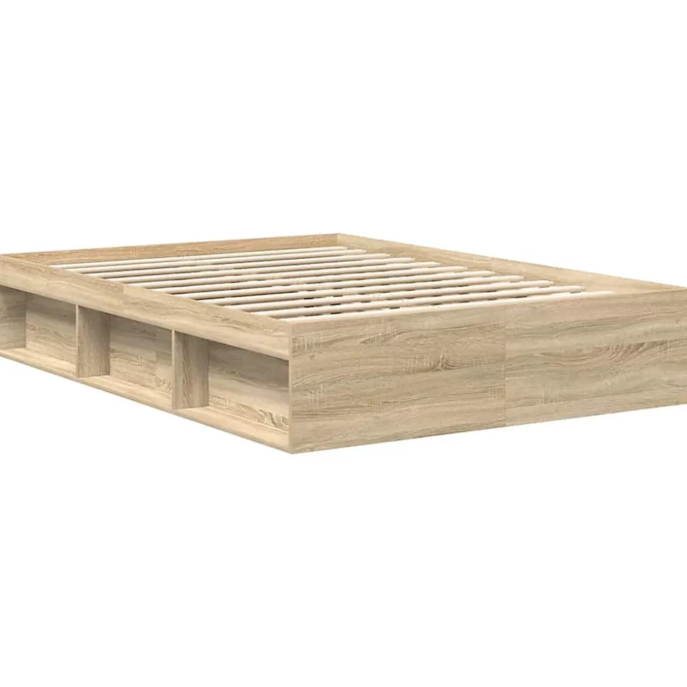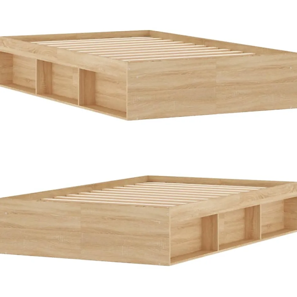 Prenez la voie moderne vers votre chambre à coucher avec ce cadre de lit ! Il sera un supplément pratique et décoratif à votre intérieur. Matériau durable : le bois d’ingénierie est d’une qualité exceptionnelle avec une surface lisse et présente également résistance, stabilité et résistance à l’humidité.Lattes de contreplaqué : les lattes de contreplaqué assurent une bonne répartition du poids, garantissant que le matelas reste en place à chaque torsion de votre corps pendant le sommeil.Espace de rangement supplémentaire : le lit d’appoint dispose d’un total de 6 compartiments sur deux côtés du lit pour ranger des objets comme des livres, des plantes en pot et d’autres décorations. Bon à savoir :Un matelas n’est pas inclus avec ce lit. Nous offrons une sélection variée de matelas. Vous pouvez consulter notre boutique pour trouver un matelas assorti. Couleur : chêne sonomaMatériau du cadre de lit : bois d’ingénierie, bois de pin massifMatériau des lattes : contreplaquéDimensions totales : 193 x 123 x 35 cm (L x l x H)Dimensions du matelas correspondant (matelas non inclus) : 120 x 190 cm (l x L)(petit double)L’assemblage est requisCouleur : chêne sonomaMatériau du cadre de lit : bois d’ingénierie, bois de pin massifMatériau des lattes : contreplaquéDimensions totales : 193 x 123 x 35 cm (L x l x H)Dimensions du matelas correspondant (matelas non inclus) : 120 x 190 cm (l x L)(petit double)L’assemblage est requis