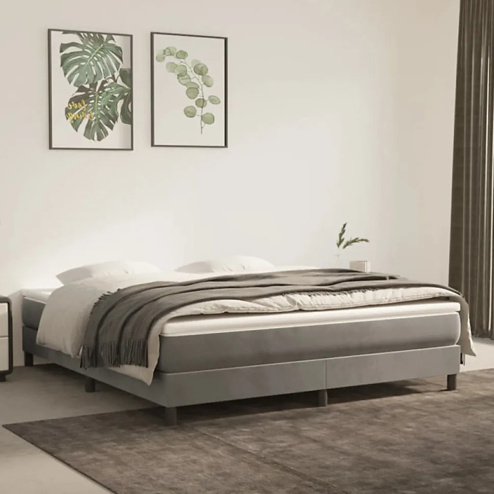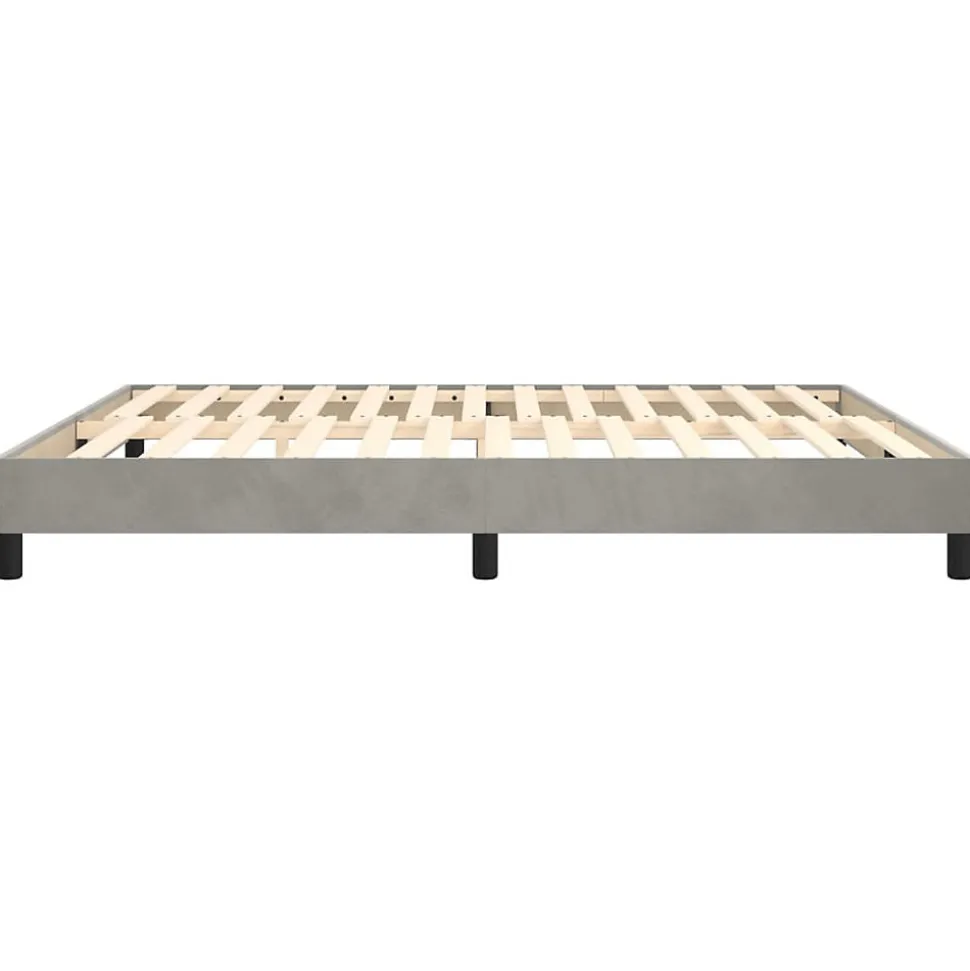 Cadre de lit sans matelas gris clair 180×200 cm en velours, alliant design élégant et robustesse. Structure bois/métal, pieds en acier, lattes en contreplaqué, tissu polyester confortable et résistant. Dimensions totales 203x180x25 cm. Compatible avec matelas 180×200 cm (matelas non inclus).