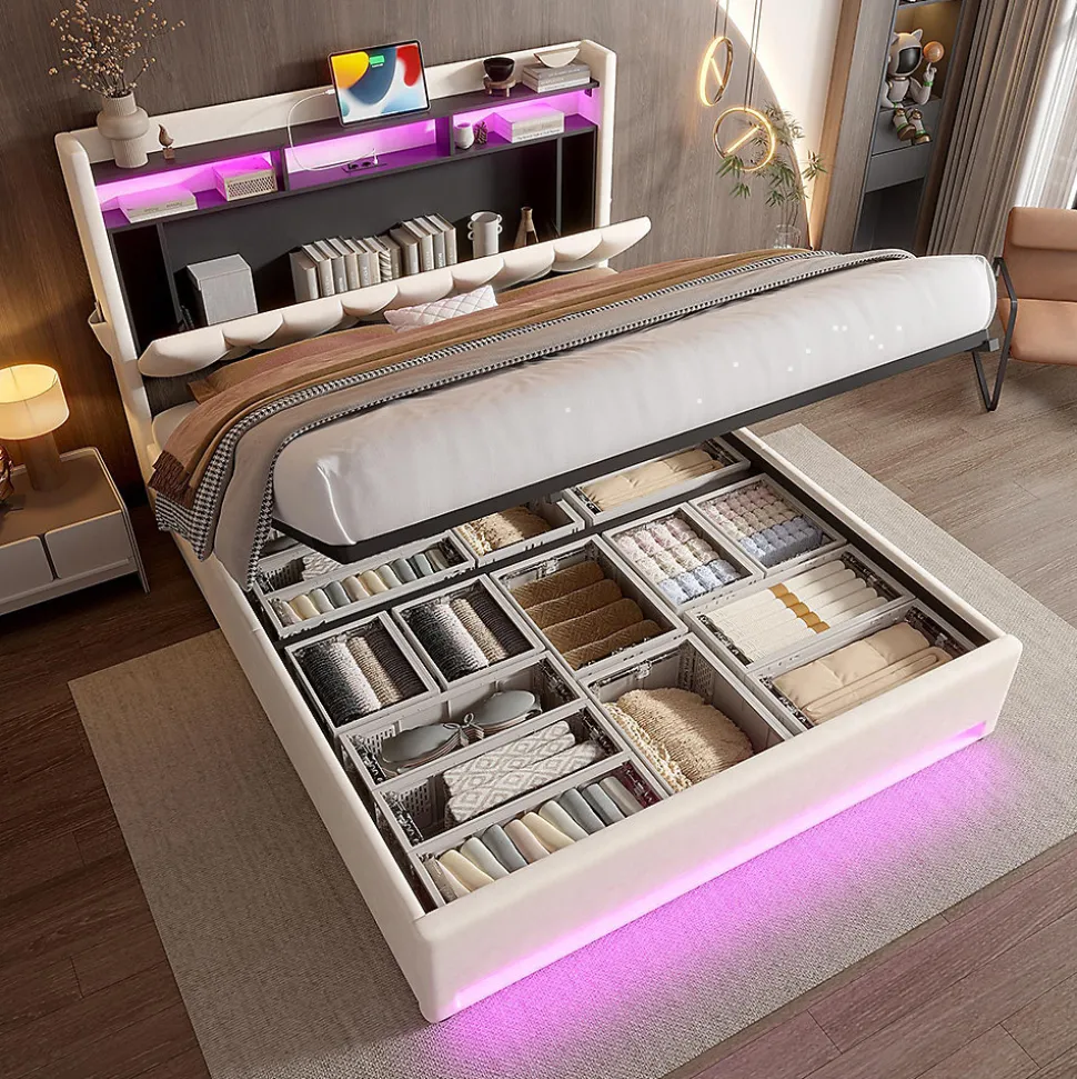 - Éclairage LED pour une atmosphère chaleureuse La bande lumineuse LED intégrée à la tête et au pied de lit offre un éclairage indirect agréable. Que ce soit pour lire ou pour créer une ambiance chaleureuse en soirée, l’éclairage crée l’atmosphère parfaite. Moderne, élégant et économe en énergie, il attirera tous les regards dans votre chambre à coucher !