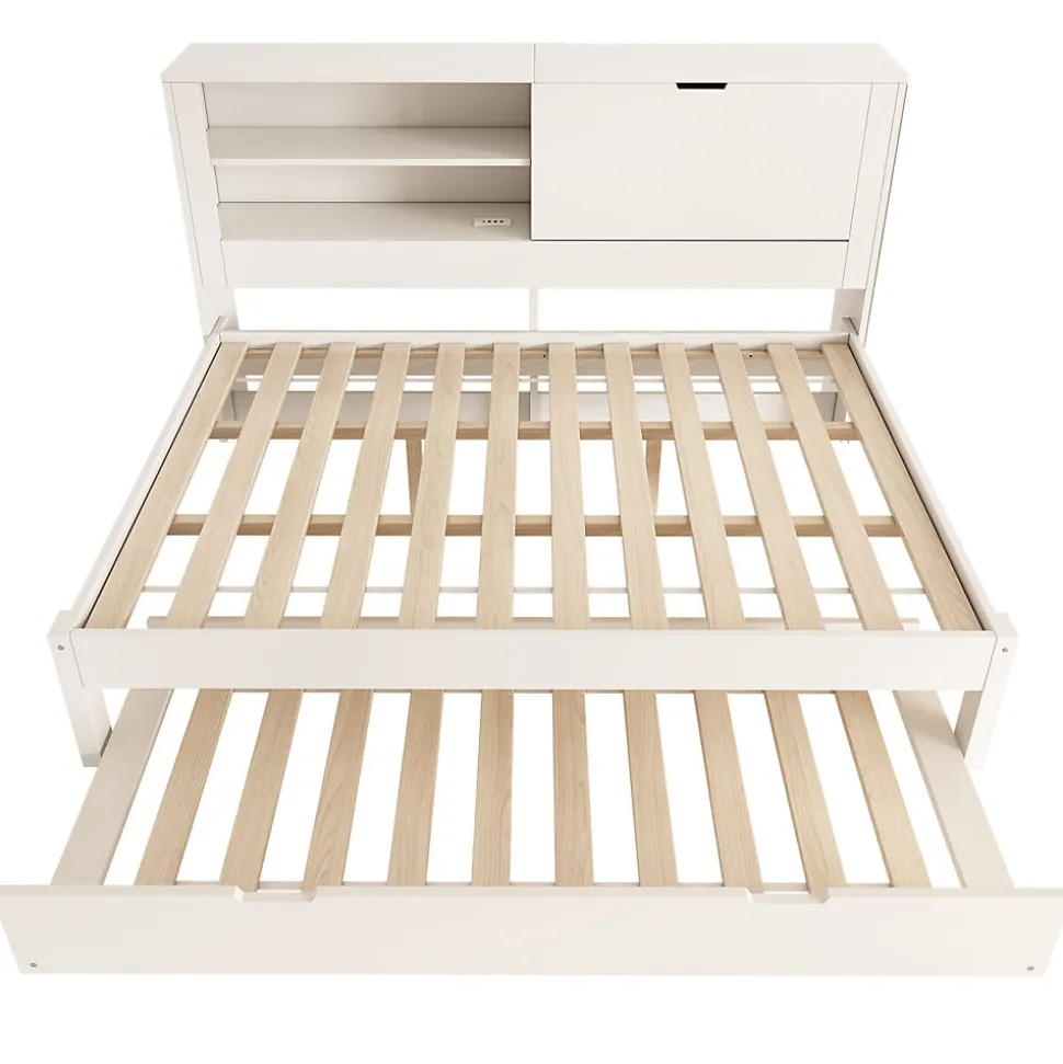 •【Canapé-lit gigogne】Son cadre gigogne est doté de poignées incurvées et de quatre roulettes pour un dépliage facile. Lorsqu’il n’est pas utilisé, il se glisse sous le lit pour un gain de place optimal. Deux des roulettes sont équipées de freins pour une stabilité accrue.•【Rangement dans le dossier】Le compartiment de rangement de droite est muni d’un couvercle à charnière, offrant un espace de rangement astucieusement dissimulé. Des charnières, des vérins à gaz et une fermeture magnétique de haute qualité garantissent une fermeture fluide, silencieuse et élégante.•【Station de charge pratique】L’étagère du dossier intègre une station de charge avec trois ports USB (dont un compatible avec la charge rapide) et un port USB-C, vous permettant de recharger simultanément votre téléphone et autres appareils électroniques avant de vous coucher.•【Détails du produit】Ce produit est fabriqué en bois de haute qualité pour une structure robuste. Le sommier à lattes encastrées empêche le matelas de glisser. L’autocollant rond blanc fourni masque parfaitement les trous de fixation. Remarque : les lits gigognes mesurent 90 x 190 cm. Il est recommandé d’utiliser un matelas de ces dimensions et d’une épaisseur maximale de 13 cm.•【Facile à assembler】Des instructions détaillées et des pièces complètes sont disponibles pour vous aider à réaliser l’assemblage rapidement.