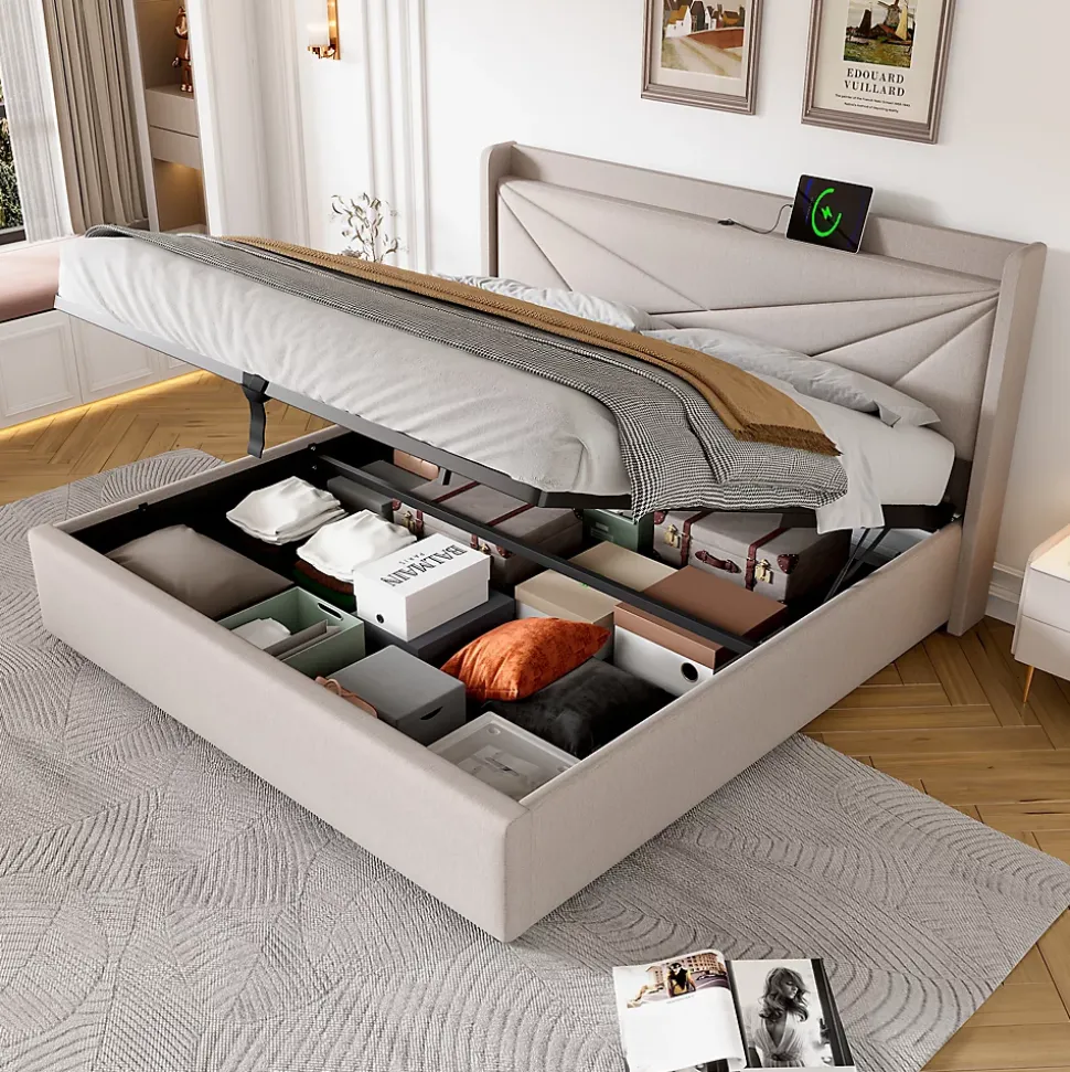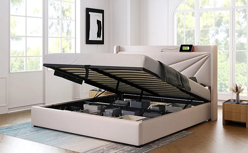 Design & styleCe canapé‑lit présente une tête de lit géométrique en maille twill et un revêtement lin‑coton beige, rembourrée de mousse pour un confort visuel et un accueil doux. Ses lignes sobres s’adaptent aux décors contemporains et minimalistes.Fonction & couchage Compatible avec une matelas 180×200 cm (matelas non fourni). Structure métallique associée à un sommier à lattes en bois massif offrant une assise stable et une capacité d’utilisation jusqu’à 300 kg (environ 660 lbs). Barres de maintien pour matelas afin de limiter les glissements.Matériaux & entretienCadre en métal, tête de lit rembourrée en mousse et revêtement en tissu lin‑coton pour un toucher naturel. Les lattes sont en bois élastique pour un soutien ergonomique. Entretien simple avec un chiffon doux et nettoyage ponctuel adapté au tissu.Rangement & ergonomieGrand coffre de rangement sous le sommier, doublé d’un non‑tissé noir pour limiter la poussière et protéger le contenu. La tête de lit intègre des ports USB et Type‑C pour recharger facilement vos appareils depuis le lit.Installation & emballageMontage requis, deux personnes recommandées. Produit livré en 2 colis (dimensions totales 186x208x107 cm) pouvant arriver séparément. Si des pièces manquent après réception des deux colis, merci de contacter le service client pour assistance.