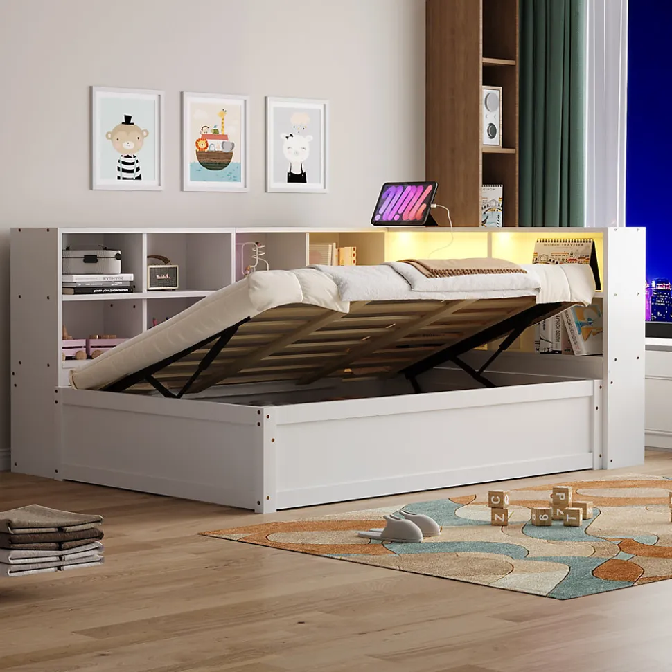 Prise multifonction intégréeCe lit simple en bois massif dispose d’une prise multifonction intégrée compatible avec différents types d’appareils, vous permettant de les recharger à tout moment tout en vous reposant ou en travaillant.Rangements suffisantsCe canapé en bois massif possède plusieurs compartiments de rangement intégrés, offrant un espace suffisant pour vos affaires.Bande LED contrôlableLa tête de lit est équipée d’une bande LED pouvant être contrôlée via votre smartphone ou une télécommande. Lorsqu’elle est contrôlée par smartphone, la lumière clignote au rythme de la musique, créant une ambiance agréable.Cadre en bois massifLe canapé-lit est fabriqué en bois massif de haute qualité, garantissant une longue durée de vie. La couleur blanche s’adapte à tous les styles de décoration. La combinaison d’une fonctionnalité moderne et d’un design élégant le rend compatible avec tous les intérieurs.Design gain de placeCe canapé-lit multifonction optimise l’espace limité et est idéal pour accueillir des invités.