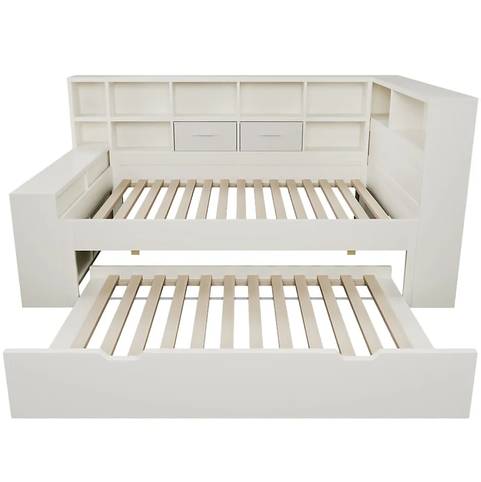 •【Ports de chargement】Les compartiments de rangement de la tête de lit offrent des options de chargement pratiques : 3 ports USB (dont un compatible avec la charge rapide) et 1 port USB-C. Vous pouvez ainsi recharger facilement votre smartphone, votre tablette et autres appareils.•【Conception gain de place】Ce lit est doté d’un sommier gigogne, optimisant ainsi sa fonctionnalité et l’espace disponible.•【Nombreux espaces de rangement】Des espaces de rangement sont prévus sur trois côtés du sommier. L’étagère de la tête de lit peut accueillir des chargeurs. Huit compartiments de rangement identiques sont situés sur les côtés du lit, et deux tiroirs en tissu inclus peuvent être insérés au besoin. L’étagère du pied de lit peut servir de bibliothèque. Elle supporte un poids maximal de 7 kg.•【Qualité garantie】Le sommier est fabriqué à partir de matériaux de haute qualité, garantissant un sommeil sûr et stable. Ce lit gigogne est équipé de quatre roulettes, dont deux avec freins pour une stabilité optimale. Toutes les ouvertures sont recouvertes d’autocollants de couleur assortie, pour une esthétique et une sécurité accrues.•【Facile à assembler】Des instructions détaillées et des pièces complètes sont disponibles pour vous aider à réaliser l’assemblage rapidement.