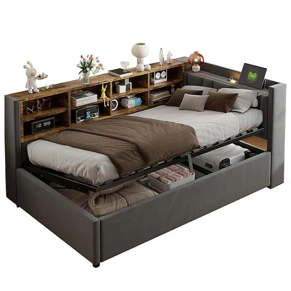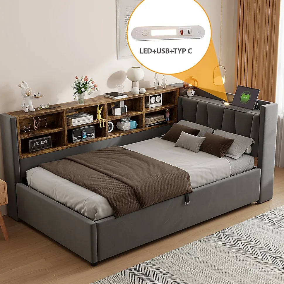 SpécificationsCouleur principale : GrisMatériau principal : VeloursDimensions du lit : 90 cm × 200 cmMatériau de rembourrage : VeloursDimensions du produitLongueur assemblé (cm) : 214,50Largeur assemblé (cm) : 100,50Hauteur assemblé (cm) : 81,00Poids du produit (kg) : 49,00Dimensions de l’emballageSous-article 1 : 197,79 × 34,98 × 11 cm 25,9 kgSous-article 2 : 96,8 × 37,39 × 23,98 cm 26,8 kgCaractéristiques du produitTête de lit rembourrée multifonctionnelle – La tête de lit rembourrée de ce canapé-lit intègre une veilleuse, des ports de recharge USB et Type-C, ainsi qu’un espace de rangement, offrant un éclairage pratique tout en vous permettant de ranger et de recharger vos appareils à tout moment. La tête de lit rembourrée à rayures classiques offre un confort optimal et confère au lit un aspect élégant et intemporel.Système de rangement hydraulique dissimulé — Ce lit rembourré avec mécanisme de rangement hydraulique offre un vaste espace de rangement dissimulé pour les livres, les jouets, les vêtements et bien plus encore.Tissu velours doux et agréable au toucher — Fabriqué à partir d’un tissu velours de haute qualité, le lit rembourré offre un toucher doux, pour une expérience luxueuse et confortable, que ce soit en position assise ou allongée.Espace de rangement généreux – Plusieurs compartiments de rangement sur les côtés du lit offrent une grande capacité de rangement, permettant de garder une chambre à coucher bien rangée et organisée. La finition bois des compartiments s’harmonise avec le tissu d’ameublement, créant une solution de rangement pratique et élégante.Robuste et durable – Ce lit rembourré multifonctionnel est doté d’un sommier à lattes robuste qui soutient le matelas et garantit un confort durable. Il peut supporter un poids maximal de 150 kg.
