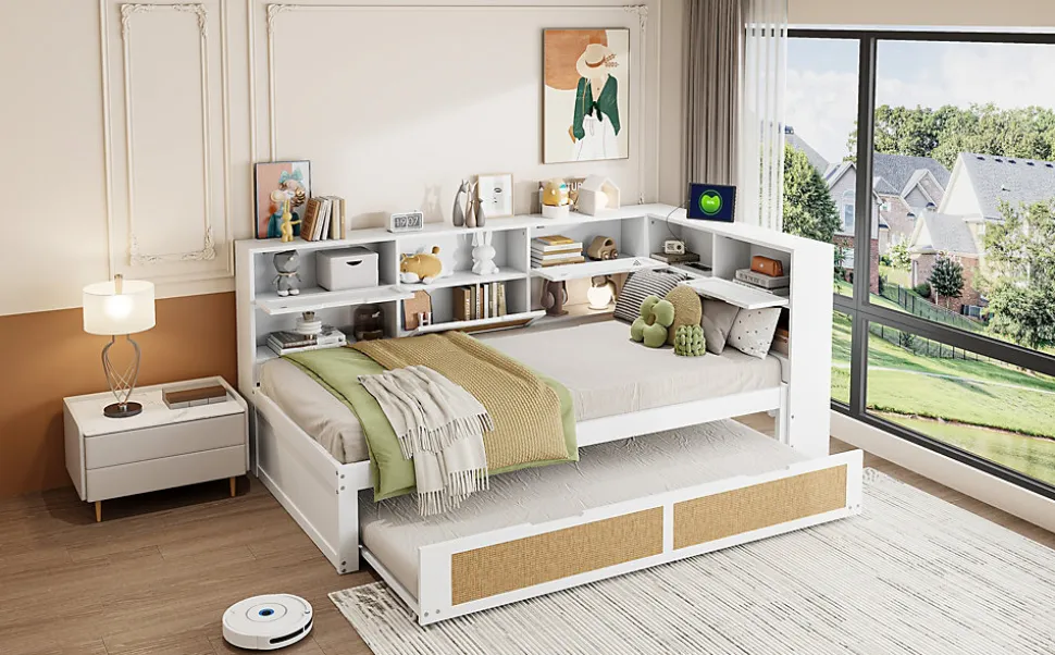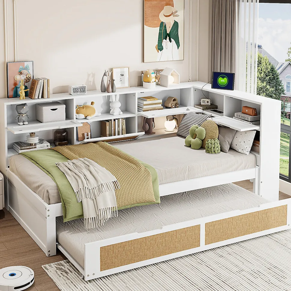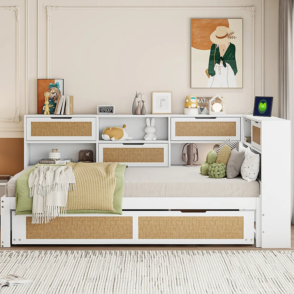 Options de couchage variées et design gain de placeCe canapé-lit multifonction optimise l’espace des petites pièces et convient aussi pour accueillir des invités. Le lit simple de 90 x 200 cm et le lit gigogne de 90 x 190 cm peuvent accueillir jusqu’à deux personnes.Prises intégrées multiplesLe lit en bois massif est équipé de plusieurs prises permettant de recharger vos appareils à tout moment, que ce soit pendant le repos ou le travail.Structure en bois massifFabriqué en bois massif de haute qualité, ce canapé-lit allie durabilité et élégance. La combinaison du bois et du rotin crée un style à la fois moderne et naturel qui s’adapte à tout intérieur.Nombreux espaces de rangementLe canapé-lit en bois massif comprend plusieurs compartiments intégrés offrant un grand espace pour ranger vos affaires.Solide, pratique et polyvalentAvec ses dimensions de 90 x 200 cm et un lit gigogne de 90 x 190 cm, ce canapé-lit polyvalent en bois massif blanc allie style, longévité et praticité pour toutes les tailles de pièces.