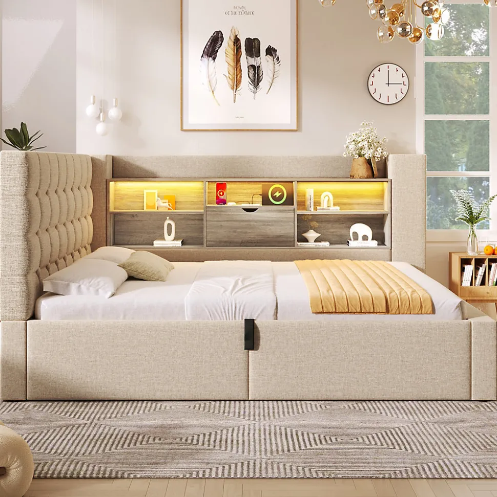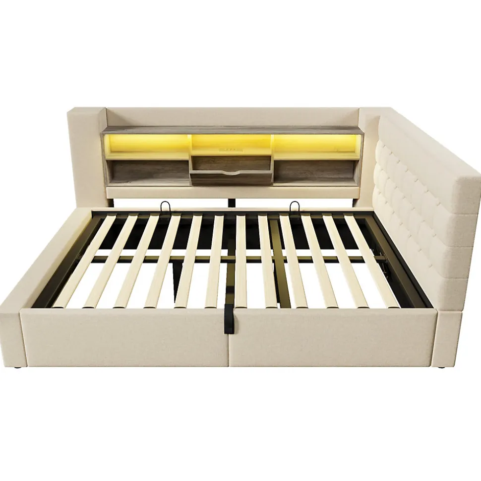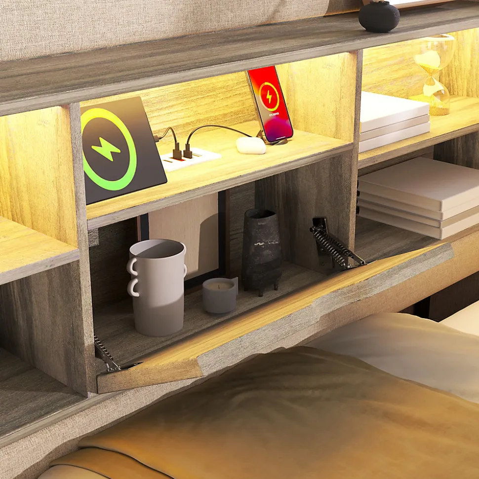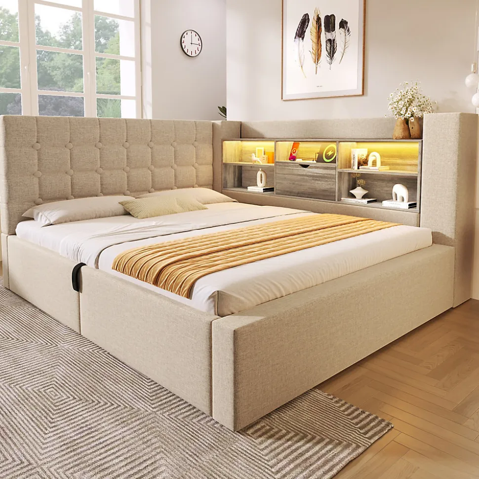 •【Éclairage LED et ports de chargement】Les compartiments de rangement sont équipés de bandes LED intégrées, contrôlables via une application ou une télécommande, avec plus de 60 000 couleurs, minuterie et modes dynamiques. Trois ports USB-A (dont un rapide) et un port USB-C facilitent le chargement des appareils.•【Design flexible en forme de L】La tête de lit offre deux options d’installation, adaptée à différentes configurations de chambre. Fabriquée en lin et panneaux bois couleur noyer, offrant un dossier confortable et moelleux.•【Grand espace de rangement】Compartiments ouverts à double niveau pour livres ou cadres photo, avec couvercle à charnière. L’espace sous le lit s’ouvre facilement grâce à un système hydraulique et des sangles de traction.•【Robuste et stable】Cadre en fer forgé avec barres de soutien en U pour empêcher le matelas de glisser, garantissant un sommeil confortable.•【Facile à assembler】Des instructions détaillées et toutes les pièces nécessaires permettent un assemblage rapide et simple.