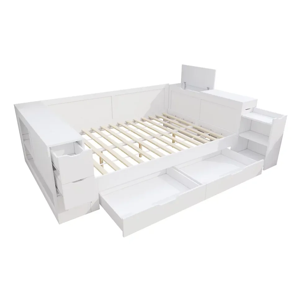 Spécifications● Couleur du produit : Blanc● Dimensions du produit : 254x145x60 cm● Matériau du produit : MDF● Poids du produit : 100 kg● Capacité de charge : 200 kg● Assemblage requis : Oui● Nombre de colis : 4Attention● Livraison en 4 colis séparés (arrivées possibles à des moments différents).● Le cadre de lit et le sommier à lattes sont inclus. Le matelas n’est pas inclus.● Pour toute question lors de l’assemblage, contactez-nous rapidement.