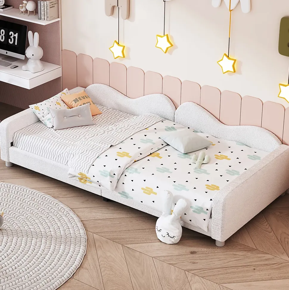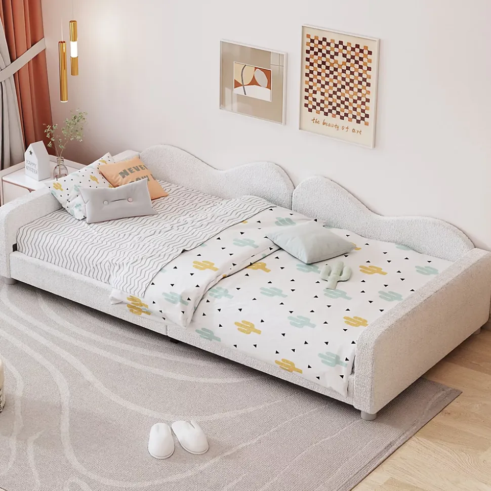 Cadre de lit multifonctionnel – Ce lit rembourré au design unique peut également servir de canapé-lit. Idéal pour le salon ou la chambre, il peut aussi être utilisé comme lit modulable pour adultes et invités.Tissu Teddy doux – Revêtement en tissu Teddy doux et confortable, résistant à l’usure et qui ne peluche pas, apportant chaleur et confort à votre espace.Confort et adaptabilité – Équipé d’un dossier, d’une tête et d’un pied de lit, il peut être placé librement à gauche ou à droite dans n’importe quelle pièce. Hauteur modérée pour un confort optimal.Support par lattes solides – Structure à 12 lattes en bois offrant un soutien robuste et durable. Capacité maximale : 120 kg. Les lattes assurent également une meilleure ventilation pour un sommeil agréable.Montage facile – Dimensions totales : 214,5 x 95 x 42 cm. Livré en colis avec tous les outils et instructions nécessaires. Installation rapide par deux personnes en environ 30 minutes.