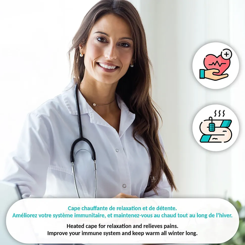 CONFORT – Les pressions ajustables de notre cape vous permettent de créer des manches et de l’ajuster selon votre préférence, tandis qu’elle reste toujours en place, quelle que soit votre position. Sa taille XXL s’adapte à toutes les morphologies, vous enveloppant entièrement pour une sensation de confort optimal. La très grande zone de chauffe garantit une répartition uniforme de la chaleur sur l’ensemble de votre corps.ÉCONOMIES – Diminuez la température de votre salon d’un ou deux degrés et bénéficiez d’une économie d’énergie allant de 7% à 20%, ce qui se traduit par des économies considérables. Notre cape chauffante est conçue pour être moins gourmande en électricité, vous permettant ainsi de rester au chaud tout en réalisant des économies.PERSONNALISÉ – Profitez de la commodité de notre télécommande qui vous permet de choisir facilement parmi 3 niveaux de chauffe (35°, 40°, 45°). Une LED clairement visible indique le niveau sélectionné pour un contrôle précis de la chaleur. Pour votre sécurité, notre cape est équipée d’une protection antisurchauffe et d’un arrêt automatique après 3 heures d’utilisation, vous offrant une tranquillité d’esprit totale.PRATIQUE – Notre cape est lavable à la main grâce à son câble d’alimentation détachable, ce qui la rend pratique à nettoyer et à entretenir. Sa matière 100% velours polyester au toucher peau de pêche est non seulement douce mais aussi durable. Avec un poids de 1,4 kg et des dimensions de hauteur de dos de 90 cm et largeur totale de 150 cm (dépliée), 130 cm (fermée), elle offre une couverture généreuse.CARACTÉRISTIQUES – Matière : 100% velours polyester au toucher peau de pêche – Poids : 1,4 kg – Dimensions : Hauteur de dos 90 cm ; Largeur totale 150 cm (dépliée), 130 cm (fermée) – Alimentation : Secteur 230 V / 50 Hz | 220-240V | 120W câble 160 cm – Certifications : CE, RoHS et AZO, garantissant une utilisation en toute sécurité.