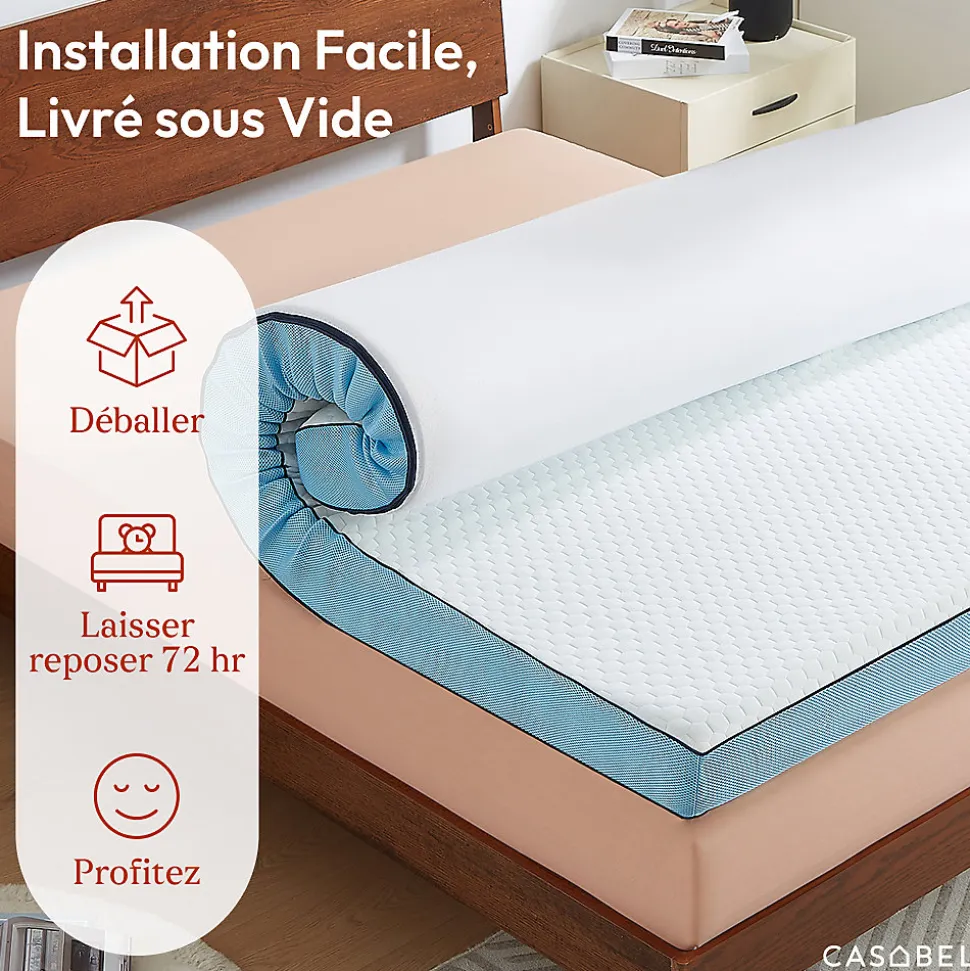- Double Face Réversible : Face bleue en mousse tonique pour un soutien ferme, face blanche en mousse à mémoire CasaNebula pour un confort moelleux. Épaisseur de 7 cm, parfait pour surmatelas 140 x 190 mémoire de forme.