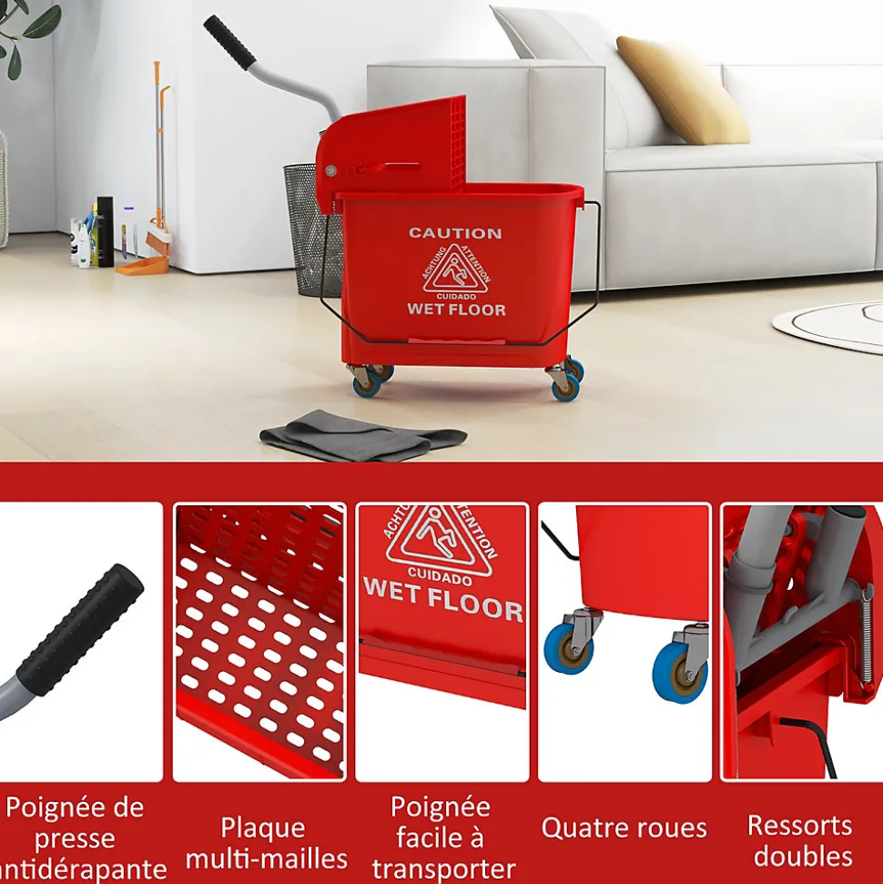Ce chariot de nettoyage lavage sur roulettes vous facilitera grandement vos ménages ! Equipé d’un essoreur et d’un séparateur eau propre et sale, vous pourrez nettoyer vos sols avec une grande rapidité et efficacité.Caractéristiques :- Chariot de nettoyage lavage avec essoreur et séparateur d’eau- Grande capacité de contenance de 20 L- Facile à déplacer grâce à ses 4 roulettes et à sa poignée- Muni d’un manche pour le transporter facilement- Poignée robuste en acier inoxydable- Essoreur et séparateur d’eau amovibles pour un entretien facile- Montage et utilisation très facileSpécifications :- 4 coloris au choix : jaune, bleu, rouge, noir-Matériaux principaux : plastique PP et métal-Dimensions totales : 60L x 27l x 71H cm- Capacité de contenance max. : 20 L- Diamètre roulettes : 5 cm- Longueur manche poignée : 32 cm- Réf. : 720-002/002V00BU/002V00RD/002V00BK