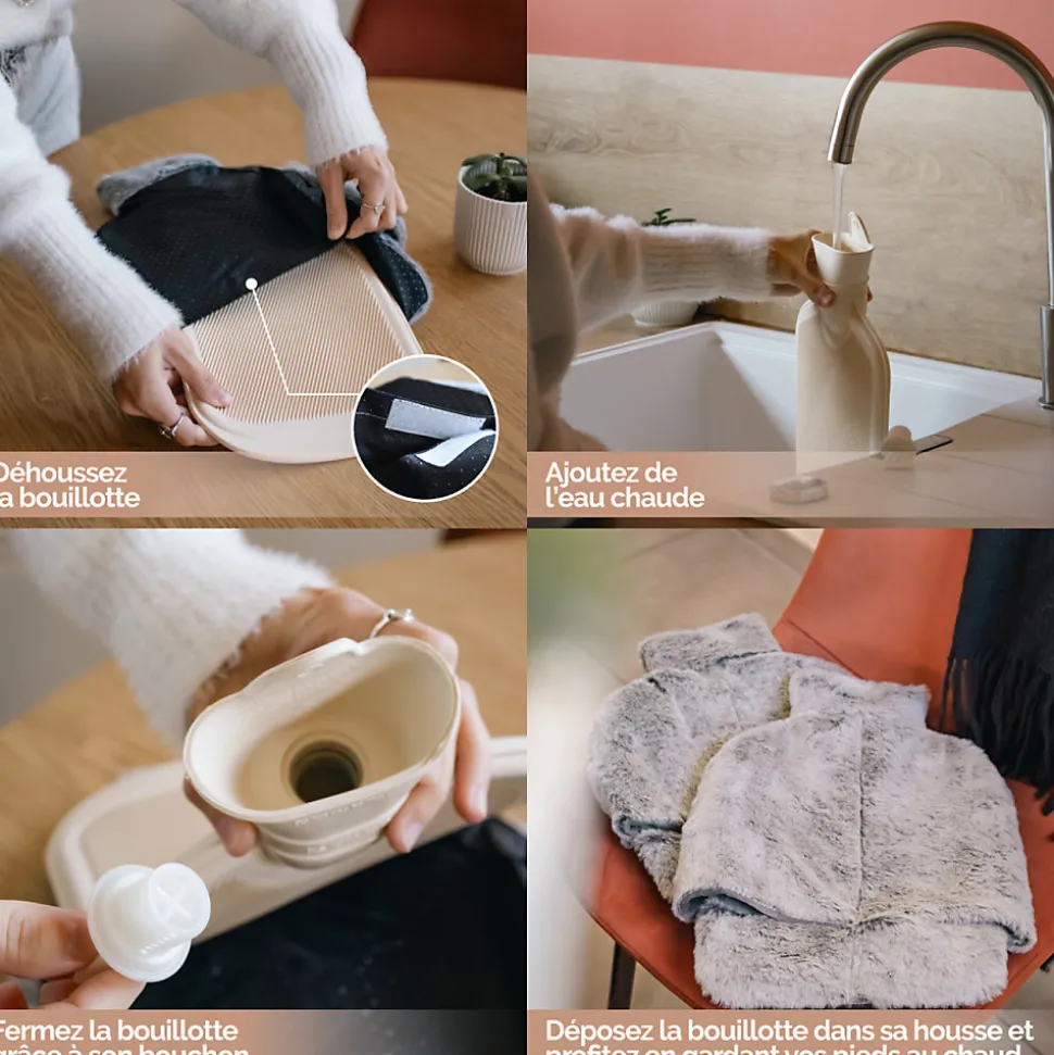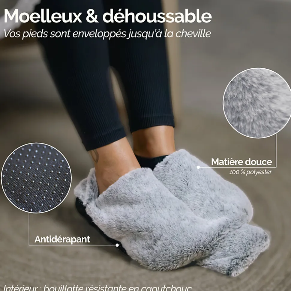 Ce chauffe-pieds bouillotte cosy de la marque Vivezen, permettra à vos pieds d’être réchauffés sans électricité. Cet accessoire très moelleux et confortable, conviendra à toute la famille à la maison, en voiture ou encore au bureau, par exemple.Glissez vos pieds à l’intérieur pour profiter d’une sensation chaleureuse de douceur. Le chauffe-pieds vous permet de vous détendre grâce à la chaleur diffuse, afin de ne plus avoir cet effet de pieds glacés. Profitez, ainsi, d’un moment douillet.Le réservoir intérieur, en caoutchouc de haute qualité, peut détenir jusqu’à 3 litres d’eau. Il est conçu avec une grande ouverture pour simplifier le versement et peut être utilisé séparément. La housse, quant à elle, est toute douce en matière 100% polyester. Elle est déhoussable et antidérapante.La housse mesure 37 cm de longueur et 30 cm de largeur. La bouillotte mesure 34 cm de longueur et 20 cm de largeur. Le chauffe-pieds bouillotte convient aux tailles entre 38 et 45 et détient un revers derrière la cheville, pour un maintien optimal. Attention, ne pas s’appuyer avec tout son poids.Notre société a pour ambition de répondre à vos besoins du quotidien en vous proposant des gammes de plus en plus variées et tendances. Un large éventail de produits est à retrouver à travers nos différentes marques.