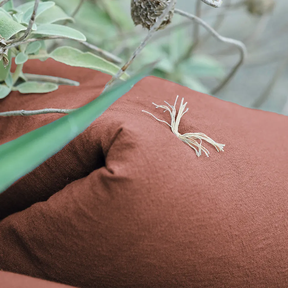 Le chemin de lit HONO DECO en 100 % coton lavé avec garnissage polyester et finition capitonnée apporte confort et élégance. En 80×200 cm, il est décliné en marron terre cuite.