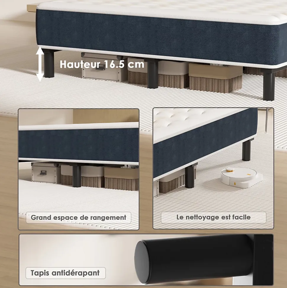 Description du produit:Épaisseur du matelas : 15 cmHauteur des pieds en plastique : 16,5 cmNombre de pieds en plastique : 9 (dimension 140) ; 6 (dimension 90)Structure : ① Tissu jacquard : mousse matelassée de 1 cm ; mousse matelassée bleue de 1 cm ; ② Tissu tricoté simple face : 13 cm, mousse haute densité 28D ; ③ Base en non-tissé rigide : mousse 3D + 0,5 cmMatériau des lattes : fer