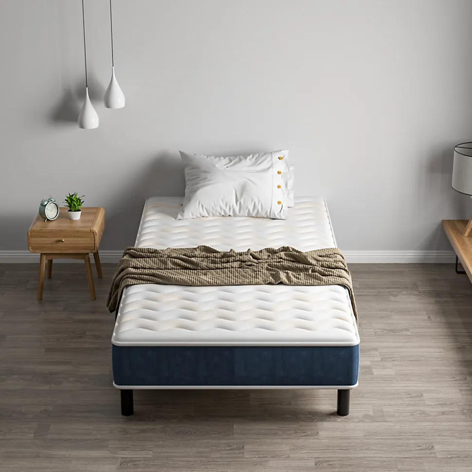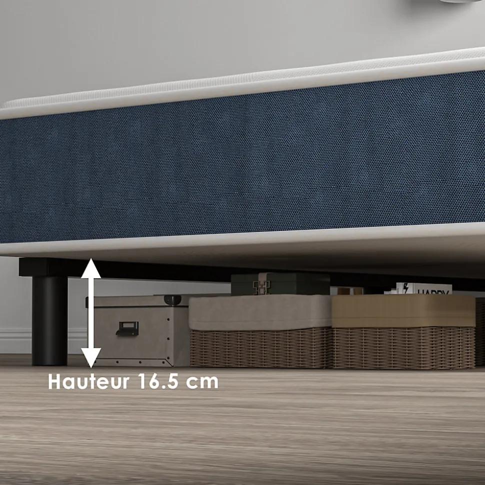 Epaisseur du matelas : 15cmHauteur des pieds en plastique : 16,5cmNombre de pieds en plastique : 6 (taille 90)Structure : ① tricot jacquard : 1cm de mousse matelassée ; 1cm de mousse matelassée bleue ; ② tricot simple : 13cm, 28D mousse haute densité ; ③ bord inférieur rigide non tissé : 3D mousse + 0,5cmMatériau des lattes : fer