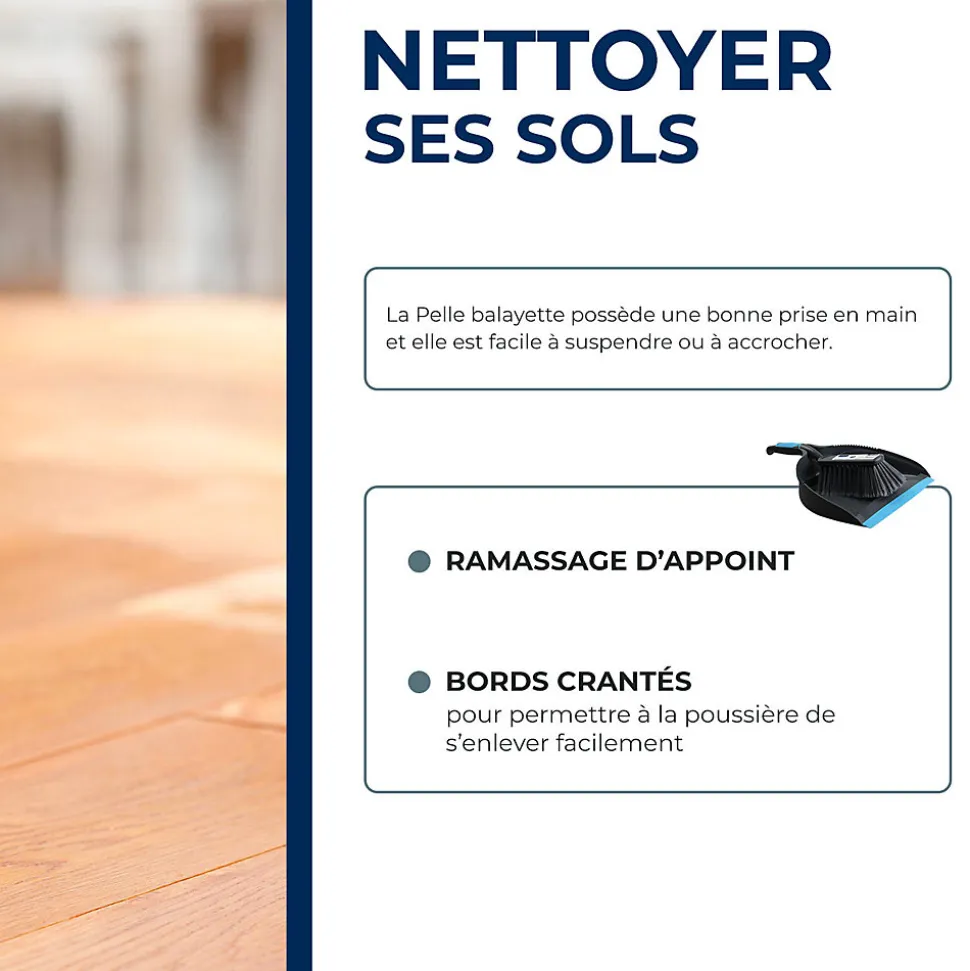 - Pelle : grande capacité avec bord souple (pour mieux adhérer au sol)