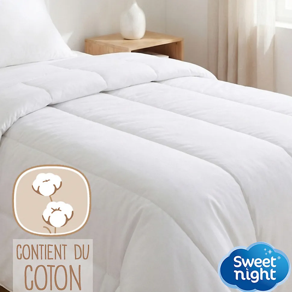Cette couette a été étudiée pour offrir un confort optimal tout au long de l’année. Son grammage de 300g/m² permet de limiter l’accumulation de chaleur par rapport aux modèles de forte densité tout en assurant une présence légère sur le dormeur. Le garnissage est fixé de manière à maintenir une épaisseur constante sur l’ensemble de la surface du produit. L’enveloppe de ce modèle est composée majoritairement de coton, une fibre naturelle qui apporte de la douceur au contact. Sa structure textile permet une perméabilité à l’air et facilite le transfert de l’humidité produite par le corps vers l’extérieur. Cette caractéristique aide à maintenir un environnement de contact sec pendant l’utilisation. La densité du tissage est étudiée pour supporter des cycles de nettoyage fréquents. Pour l’entretien ce produit est lavable intégralement en machine à une température de 40°C. Sa structure permet un temps de séchage réduit après lavage. Concernant la fabrication aucune substance chimique n’est ajoutée après la confection ce qui signifie que le produit ne reçoit aucun traitement biocide anti-acarien ou antibactérien. Ce modèle blanc est disponible en taille 140 x 200 cm pour les lits une personne ainsi qu’en taille 220 x 240 cm pour les lits deux personnes afin de s’adapter précisément à votre literie.