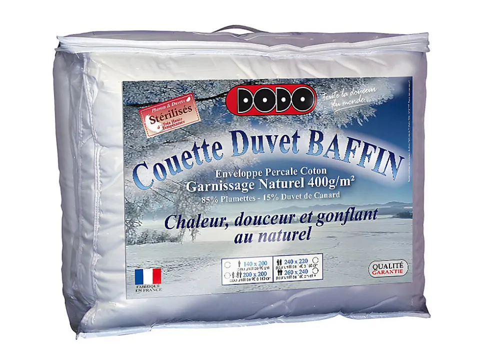 - Couette naturelle DODO BAFFIN 85% duvet de canard, 15% plumettes. Chaleur, douceur et gonflant. Enveloppe percale. Garnissage stérilisé anti-allergies, anti-moisissures.