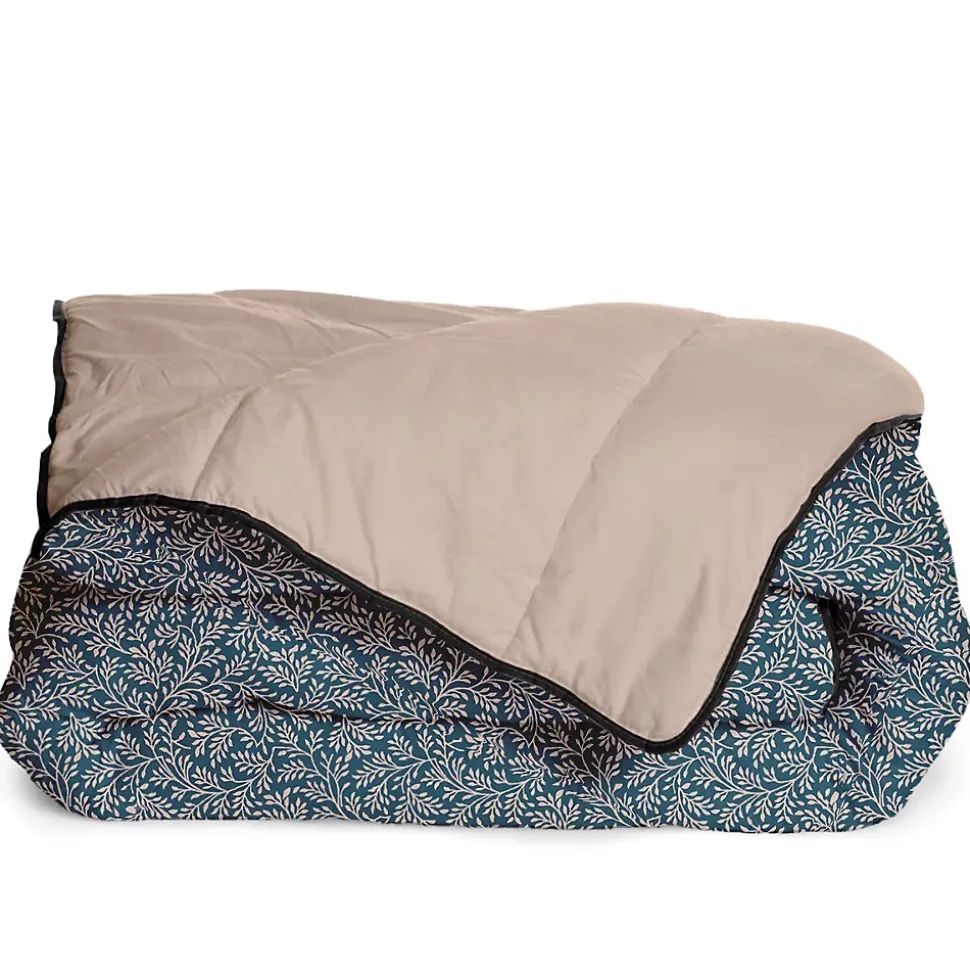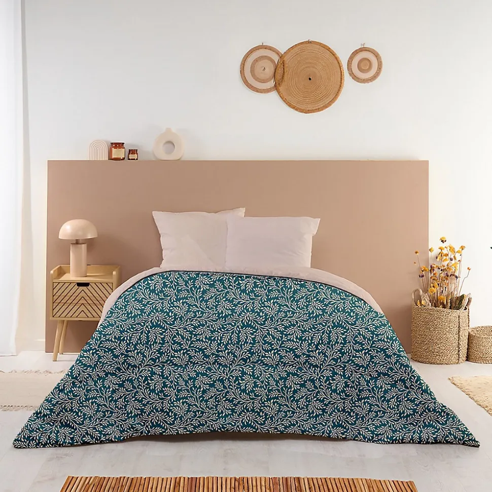 La couette imprimée Omara de Bleu Câlin- Couette Chaude 350g/m²- Fabrication Française- Utilisation sans housse- Lavage en machine à 40°CChaleur et douceurFabriquée avec soin dans nos ateliers français, la couette Omara de Bleu Câlin vous enveloppe de confort pour des nuits paisibles. Son enveloppe en microfibre au toucher ultra-doux procure une sensation agréable sur la peau, tandis que son garnissage en fibre creuse siliconée 350g/m² assure une chaleur réconfortante, parfaite pour les saisons froides.Raffinement et polyvalenceCe modèle réversible s’adapte à vos envies : utilisez-le avec une housse comme une couette classique, ou bien seul pour mettre en valeur son élégant imprimé. Son motif végétal délicatement dessiné, avec ses fines branches et feuillages entrelacés sur un fond bleu paon profond, apporte une touche de nature et sophistication à votre chambre à coucher.Important Taille Couette :1 personne : 140x200cm2 personnes : 220x240cmCe produit est certifié de la norme OEKO-TEX Standard 100 – Testé pour les substances nocives.Produit comportant au moins 70% de matières recycléesProduit totalement recyclable