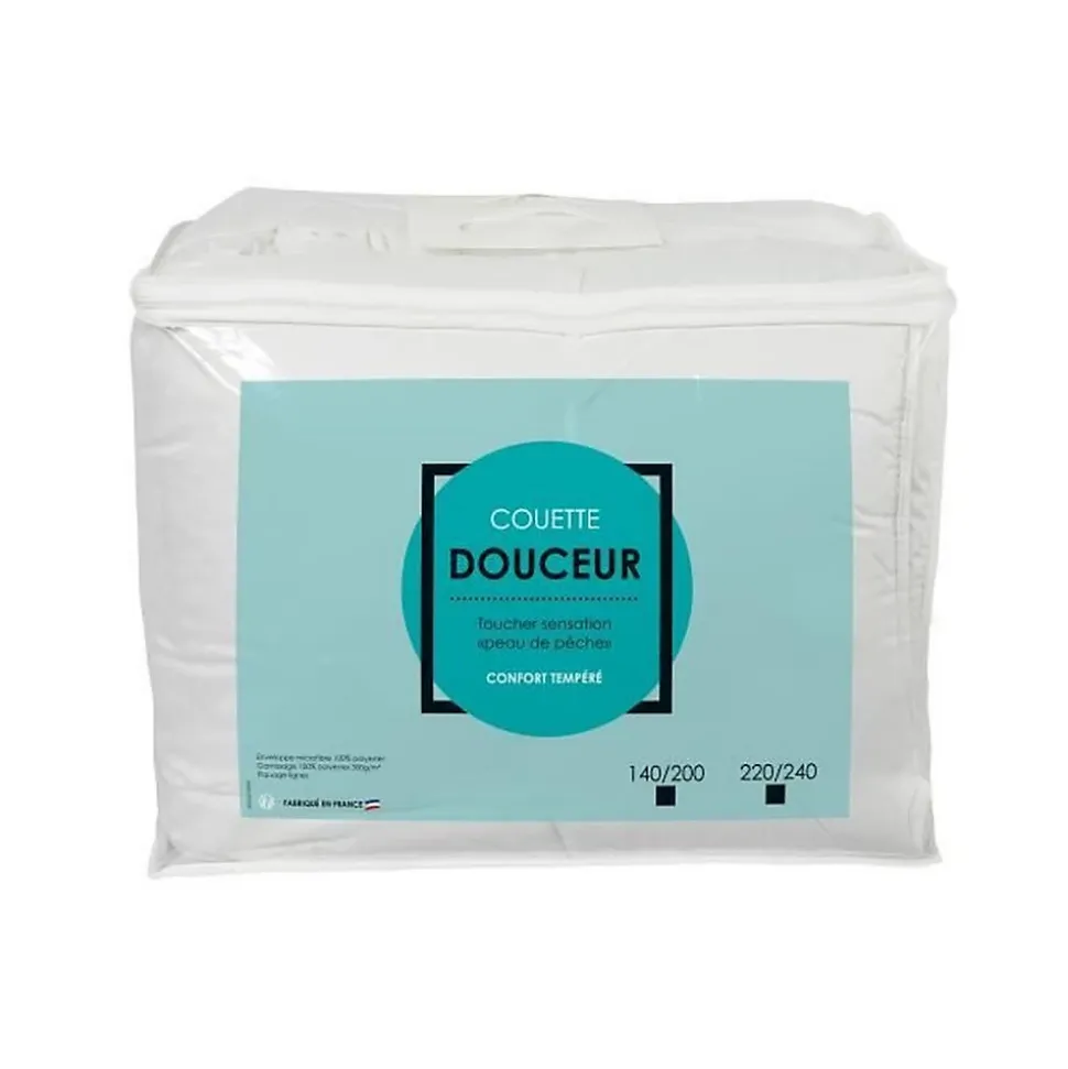Couette Tempérée Microfibre 140x200cm – Enveloppe Microfibre 100% Polyester – Garnissage 100% Polyester 300g/m² – Piquage Lignes – Finition Bourdon – Livré sous sachet cristal avec encart neutre – Fabrication Française