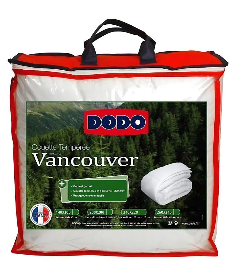 DODO – Couette tempérée VANCOUVER – 2 personnes – 240×260 Couette blanche – Douce et confortable – Fabriqué en France Vous etes a la recherche d’une couette douce, gonflante et confortable ? DODO a ce qu’il vous faut ! La couette VANCOUVER sera idéale pour vous, en plus de ses qualités de confort , son enveloppe en polycoton lui permet de résister dans le temps.