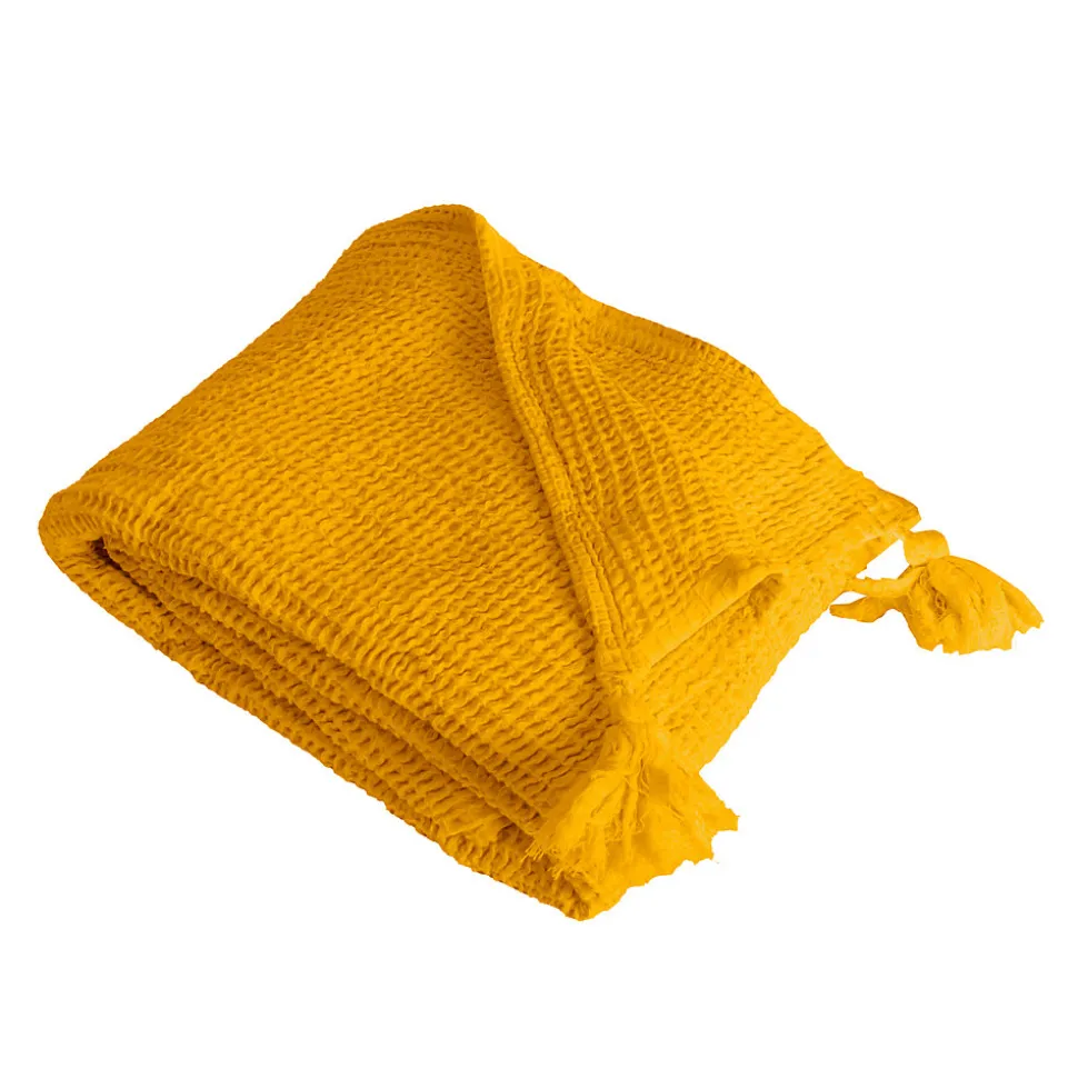 Douceur coton jaune : Le coton 100% offre un toucher doux et une respiration optimale pour un confort durable., Confort naturel : Alliez élégance et détente avec ce plaid en coton 100%., Éclat jaune naturel :