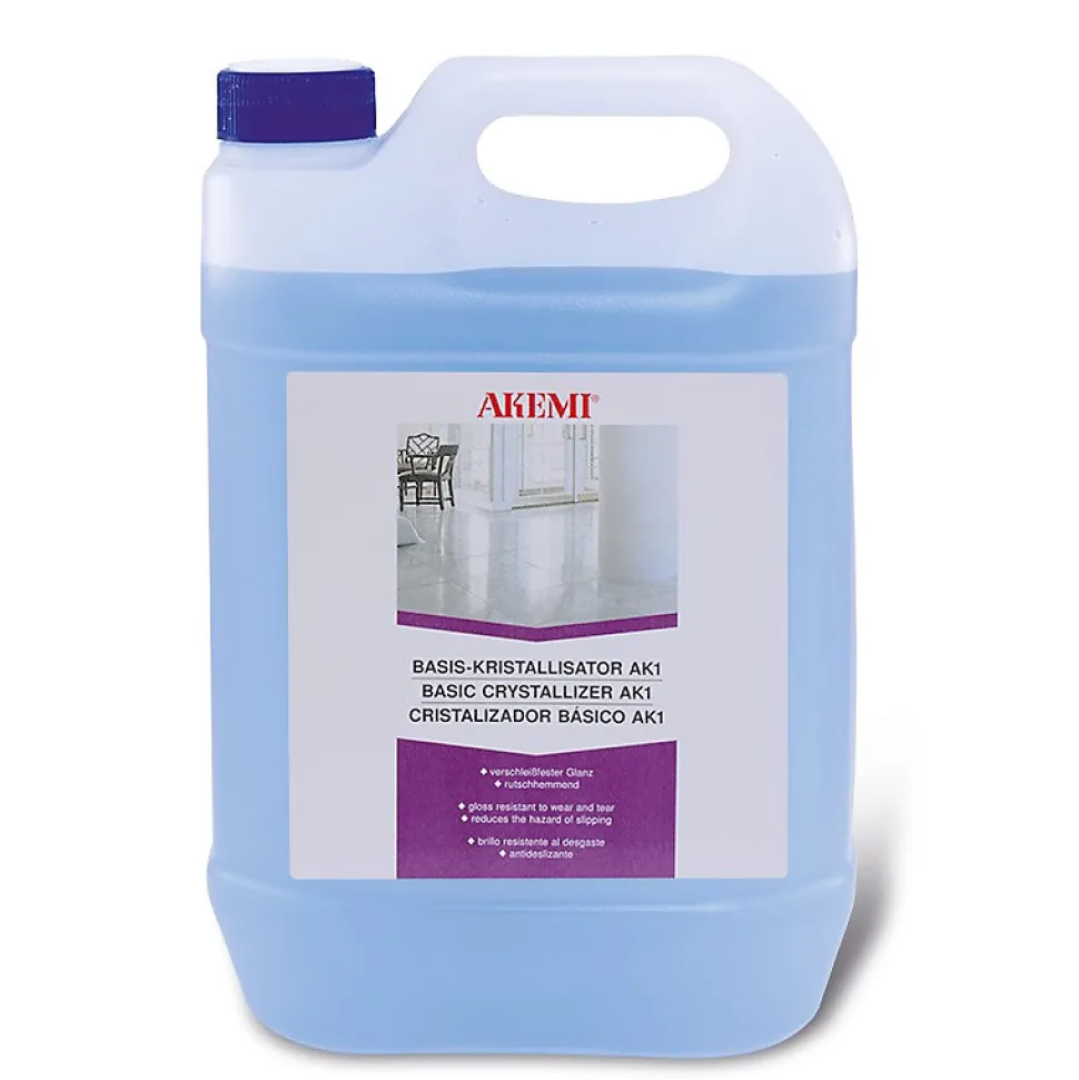 Cristallisant Base AK1 – AkemiPour le traitement des sols neuf et anciens en pierre calcaire ou en pierre reconstituée.La résistance à l’usure de la surface augmente sous l’effet d’une réaction chimique; il en résulte une brillance éclatante combinée à un ravivage de la couleur ainsi qu’à une action antidérapante. Les taches ternes et les traces de passage peuvent être éliminées après plusieurs applications répétées.Caractéristiques : Polissage du marbre, de la pierre calcaire, du granito sans formation de coucheAugmente le degré de brillanceAugmente la fonction anti glisseAméliore la surface de la pierreRéduit la salissure, facilite l’entretienRenforce la structure et la couleurIdéal pour un renouvellement du poli ou des sols devenus matsUtilisation très facilePeu de bruit, de saleté et de poussière pendant l’utilisationUtilisation : Secouer avant l’utilisation.Pour les surfaces anciennes et fortement rayées, il est recommandé de procéder à un ponçage préliminaire jusqu’au grain 400 ; les trous ou les dommages doivent être comblés avec les colles AKEMI.La surface doit être propre, sèche et sans couches. La température d’utilisation optimale est entre 15 et 25°C ; arrêter le chauffage par le sol suffisamment à l’avance, éviter l’exposition directe au soleil. Ne traiter qu’une petite surface de 2 à 3 m² par section. Pulvériser régulièrement environ 10 à 20 ml/m² du produit et immédiatement polir à l’aide d’une monobrosse lourde (poids min. 50 kg ; env. 150 tr/min) et un pad de laine fine en acier inoxydable et un pad en plastique (par ex. pad de cristallisation bronze) en effectuant des mouvements croisés au-delà du séchage. Si nécessaire, répéter l’opération
