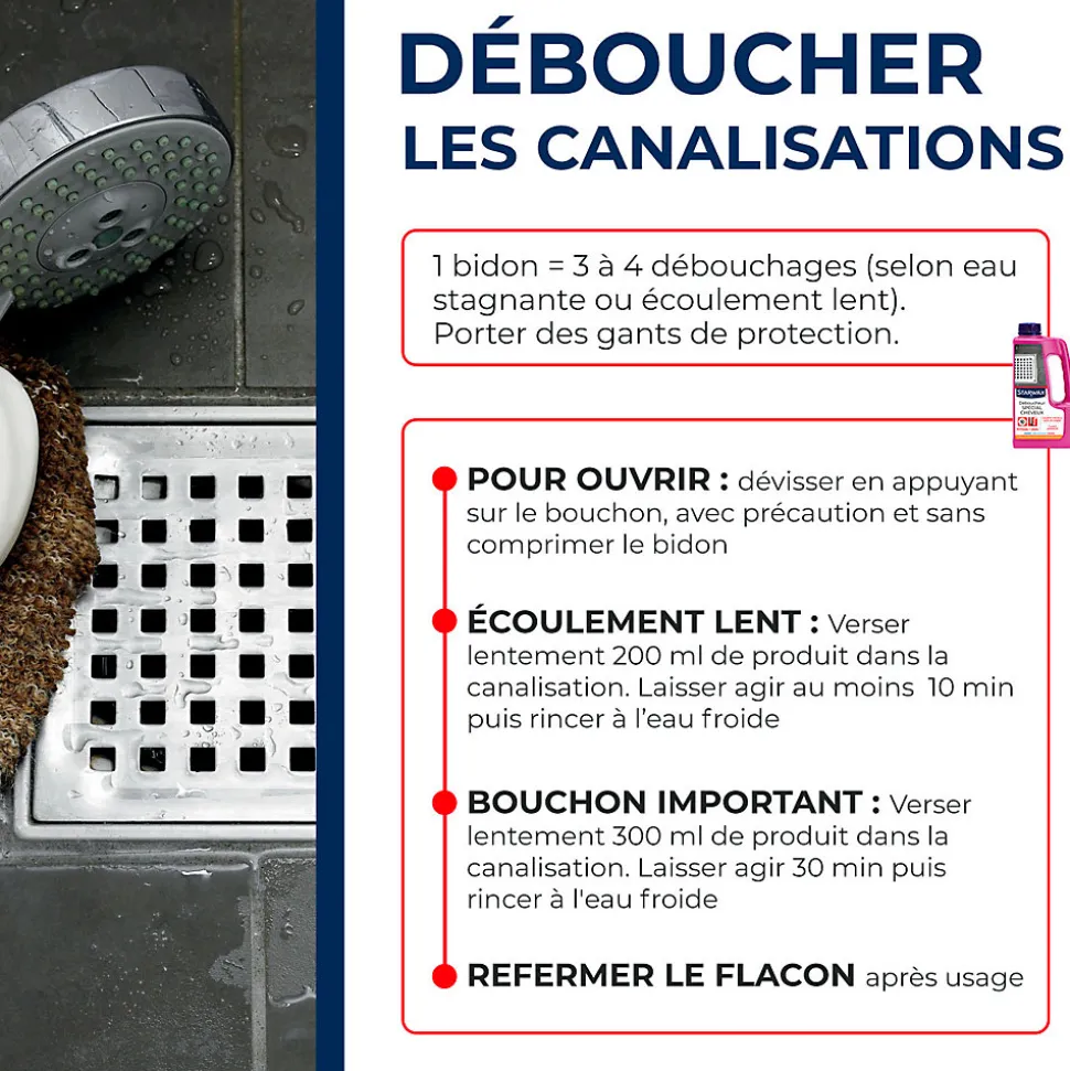 - 1 bidon : jusqu’à 4 débouchages