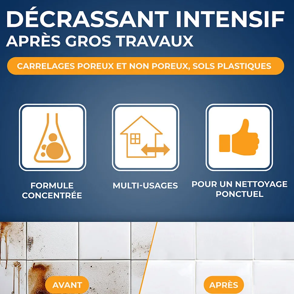 Le décrassant intensif est idéal pour un décrassage ponctuel après gros travaux, déménagement ou rénovation. Facile d’utilisation et très efficace, ce produit est applicable sur les carrelages poreux ou non et sols plastiques. Sans effort, il agit en 10 minutes et élimine en profondeur les salissures les plus tenaces (crasse, graisse, huile de vidange…, ).