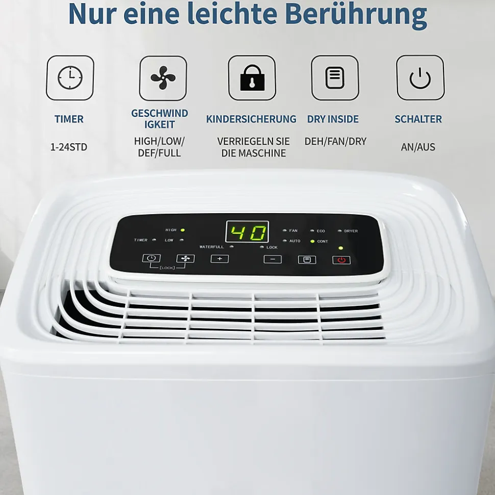 1. Puissante capacité de déshumidification:Ce déshumidificateur à compresseur élimine jusqu’à 12 litres d’humidité par jour. Son réservoir d’eau de 1,5 L réduit la fréquence de vidange. Idéal pour la cave, buanderie, salle de bain, salon ou chambre.2. Minuterie intelligente et contrôle de l’humidité: Équipé d’une minuterie réglable de 1 à 24 heures et d’un capteur d’humidité, l’appareil ajuste automatiquement le taux d’humidité souhaité et s’allume ou s’éteint selon les besoins.3. Sécurité renforcée et dégivrage automatique: Lorsque le réservoir est plein, une alarme sonore se déclenche et l’appareil s’arrête automatiquement, évitant tout débordement. La fonction de dégivrage automatique garantit une utilisation fiable même en hiver.4. Écran LED et 3 modes de fonctionnement: L’écran LED affiche le taux d’humidité en temps réel. Trois modes sont disponibles : mode automatique, mode séchage du linge et mode nuit. La sécurité enfant empêche toute modification accidentelle des réglages.5. Appareil multifonction 3 en 1: En plus de la déshumidification, ce déshumidificateur intègre un filtre pour la purification de l’air, contribuant à un environnement intérieur plus sain, sec et agréable.&Spécifications&● Taille du produit:49,5*29,5*18,5 cm● Couleur : blanc● Matériau:plastique● Domaine d’application:15㎡● Capacité de déshumidification:12L/jour● Taille du réservoir d’eau:1,5 L● Taille de l’emballage:52,5*32,8*21,5 cm● Poids brut:10,2 kg● Poids net:8,5 kg● Puissance nominale:240W● Numéro de colis:1&Remarques&※ En raison de la mesure manuelle, un écart de 2 à 3 cm peut se produire.※ En raison de l’influence de la lumière du soleil et d’autres facteurs, il peut y avoir de légères différences de couleur.
