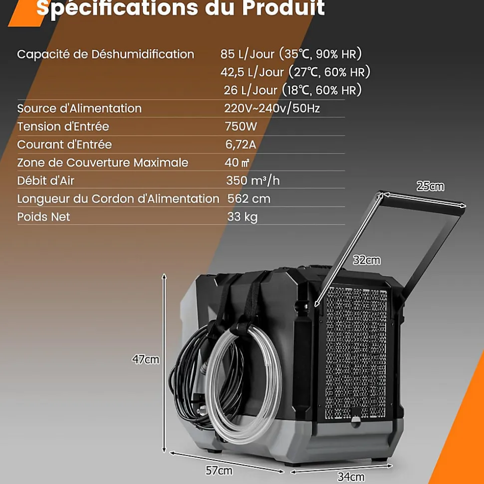 - Déshumidification efficace : Nos déshumidificateurs robustes peuvent déshumidifier jusqu’à 85 L par jour et conviennent aux grandes pièces jusqu’à 100m². L’évent d’air assure quant à lui un flux d’air de 355 m³/h, idéal pour les environnements commerciaux ou industriels.