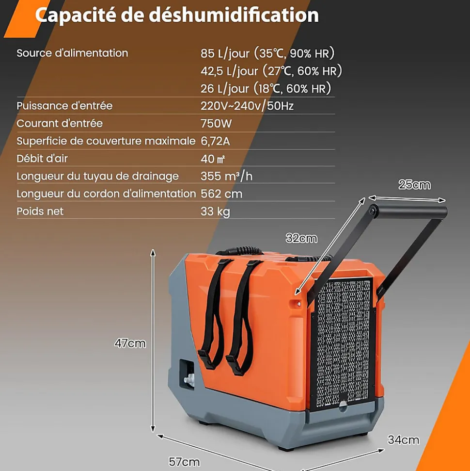 Matériau : LLDPEDimensions du produit : 57 x 34 x 47cm (L x l x H)Largeur de la poignée : 25 cmLongueur de la poignée : 32 cmCapacité de déshumidification :85 L/jour (35℃, 90 % HR)42,5 L/jour (27℃, 60 % HR)26 L/jour (18℃, 60 % HR)Source d’alimentation : 220V~240V/50HzPuissance d’entrée : 750WCourant d’entrée : 6,72APlage de capture maximale : 40㎡Débit d’air : 355 m³/hPlage de réglage de l’humidité de l’air : 20 % – 90 %Longueur du tuyau de drainage : 325 cmHauteur verticale de l’écoulement : 400 cmLongueur du cordon d’alimentation : 562 cmNiveau sonore : ≤55 dBPoids net : 33 kg