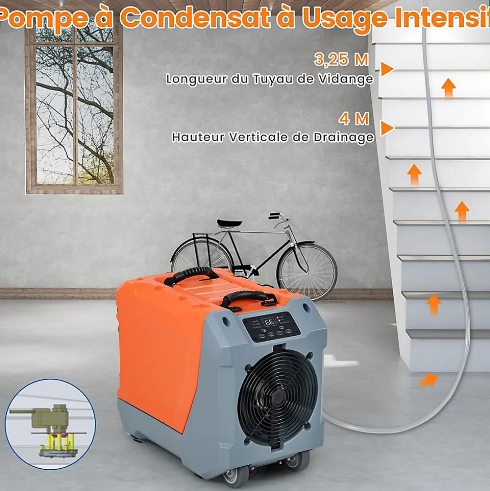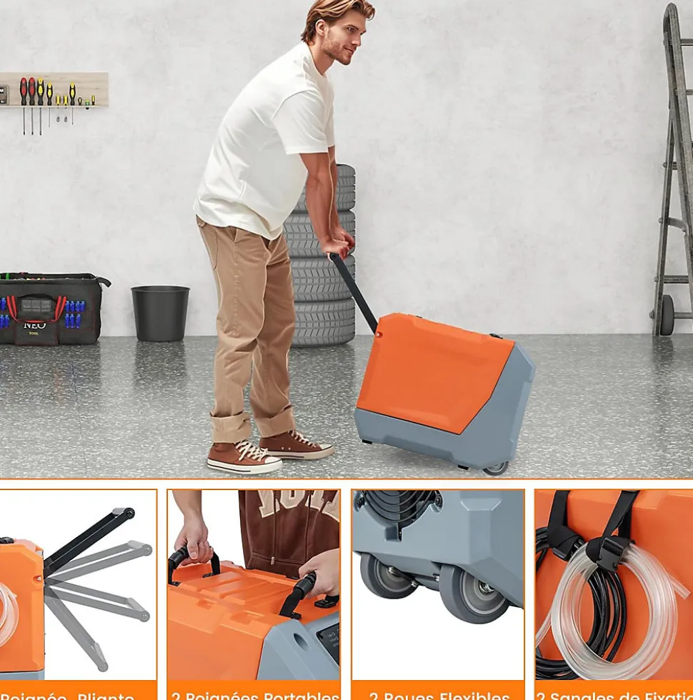 - Vidange pratique & facile : La pompe à condensat intégrée et le tuyau de 325cm assurent une vidange continue, pour votre plus grand confort. Avec une poignée pliable, 2 poignées de transport et 2 roulettes, ce déshumidificateur de pièce peut être facilement transporté.