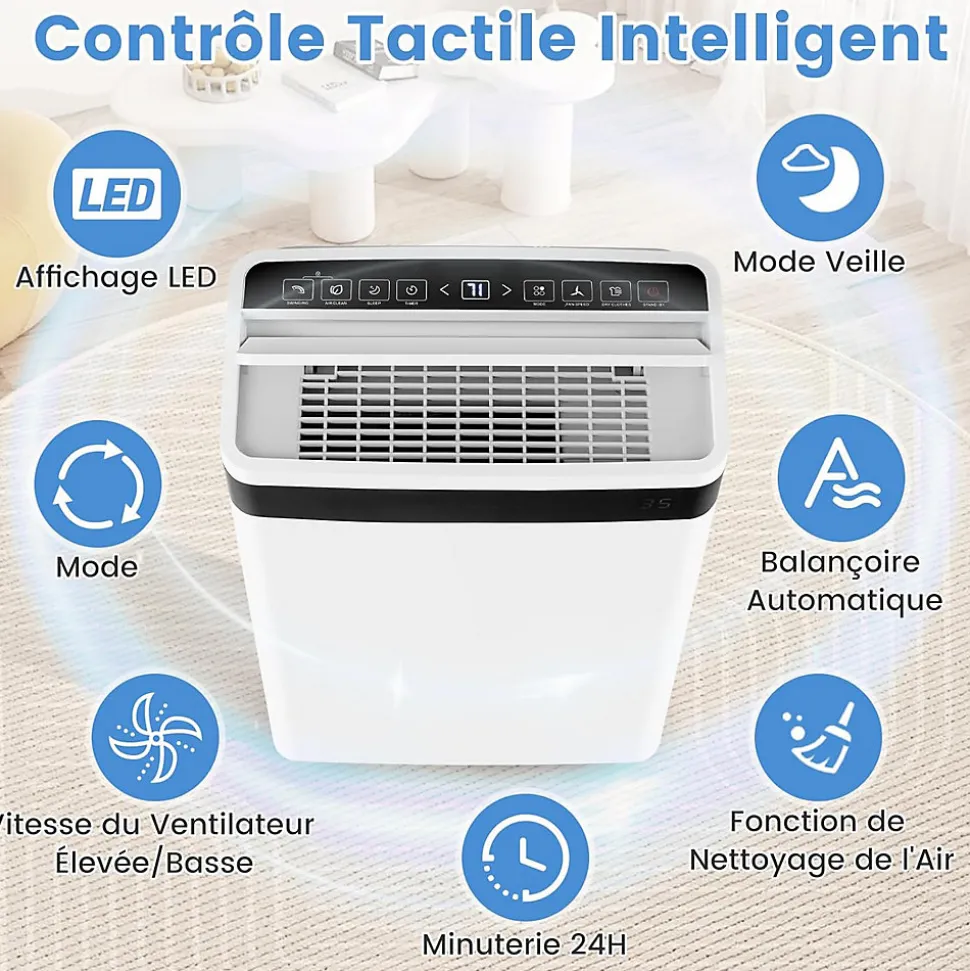 - Contrôle Tactile Intelligent : Le déshumidificateur électrique est équipé d’un écran LED et d’un panneau tactile intelligent. Vous pouvez facilement configurer plusieurs fonctions selon vos besoins : vitesse de ventilateur haute/basse, minuterie de 24 heures, mode veille, oscillation automatique, fonction de nettoyage de l’air, etc.