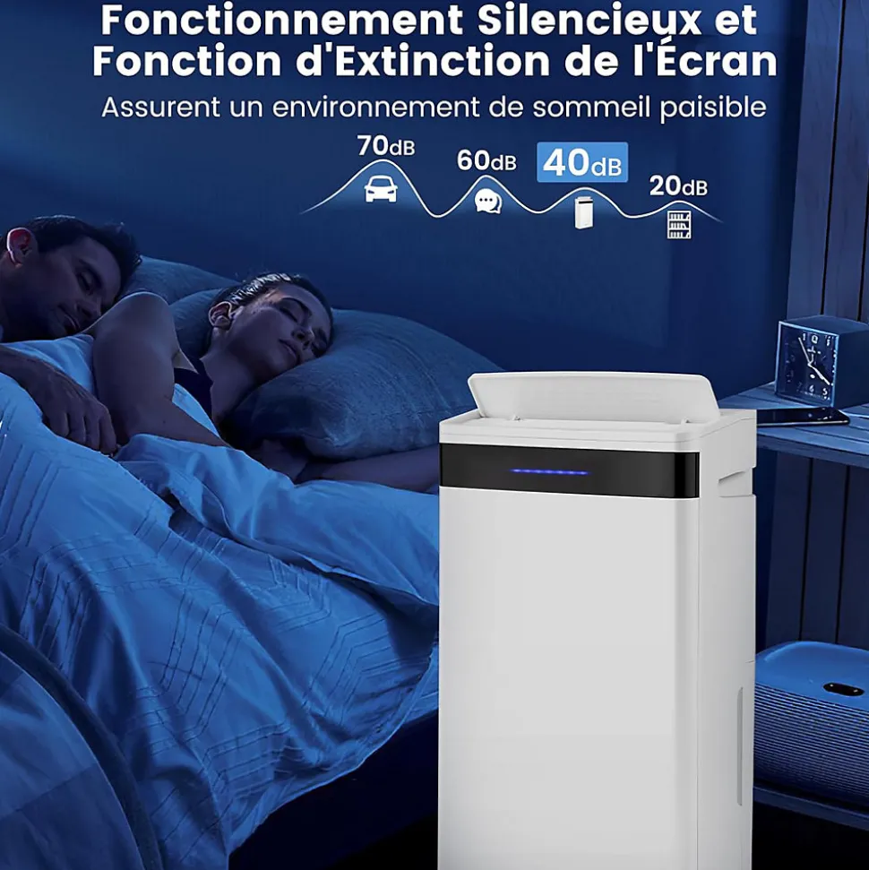 - Fonctionnement Silencieux et Visualisation : Le déshumidificateur produit seulement 40db de bruit en mode silencieux, et il dispose aussi d’une fonction d’extinction de l’écran, garantissant un environnement calme pour dormir. De plus, le voyant lumineux à trois couleurs indique l’humidité actuelle : bleu 70%.