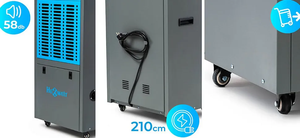 Efficace déshumidificateur Hexwelt HW-138L de puissance 1400 W et capacité 138 l/24 h efficacement élimine humidité de surfaces jusqu’à 240 m². Équipé de 10 L réservoir, système drainage et agent R290.