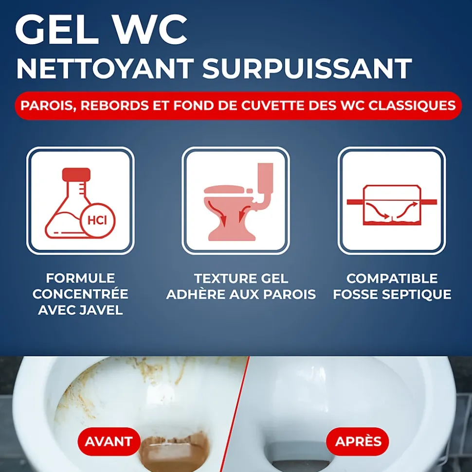 Pour nettoyer et désodoriser les cuvettes de toilettes tout en leur redonnant de la blancheur utilisez le Gel WC surpuissant avec Javel. Sa formule concentrée en gel lui confère une meilleure couvrance et adhérence pour plus d’efficacité.
