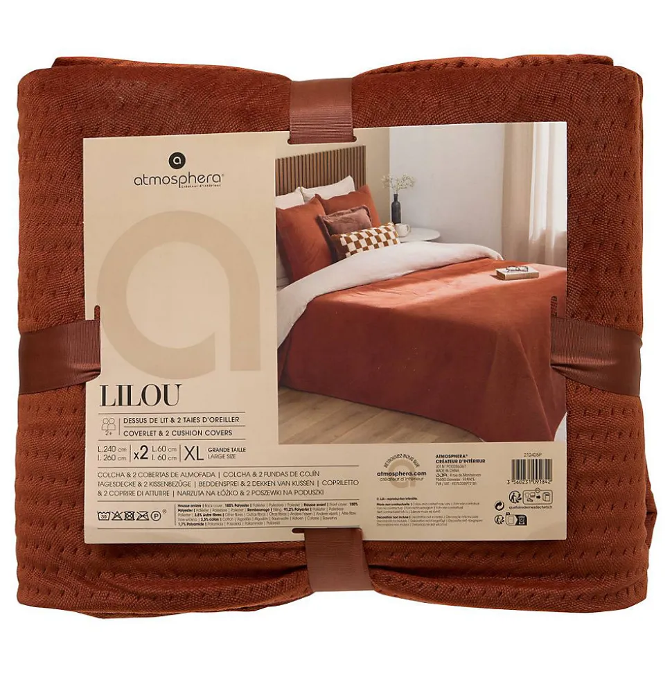 Finalisez la déco de votre chambre avec le ravissant dessus de lit et les 2 taies d’oreiller carrées Lilou Atmosphera. Le dessus de lit est texturé pour apporter une note de raffinement à votre espace. Ses dimensions généreuses en feront la pièce maîtresse d’un grand lit deux places. Le tissu en polyester est doux et rembourré afin d’augmenter le confort et l’ambiance cosy de votre literie. Ajoutez quelques coussins Atmosphera pour rendre votre dessus de lit Lilou encore plus dOUIllet.100% polyesterNon réversible Rembourrage en coton recyclé2 taies d’oreiller carrées inclusesComment déballer le dessus de lit Lilou ? Lors de l’ouverture de votre colis, veillez à ne pas enfoncer une lame trop profondément pour éviter d’endommager le produit. Retirez les éléments de protection et d’emballage avec précaution, sans utiliser d’outils tranchants. Comment entretenir le dessus de lit Lilou ? Le dessus de lit Lilou est lavable en machine ou à la main. Ne pas sécher au soleil. Ne pas sécher au sèche-linge. Ne pas repasser. Ne pas utiliser de produits de blanchiment. Ne pas nettoyer à sec. Dimensions produit : L.260 x l.240 x H.1 cmPoids : 2,32 Kg