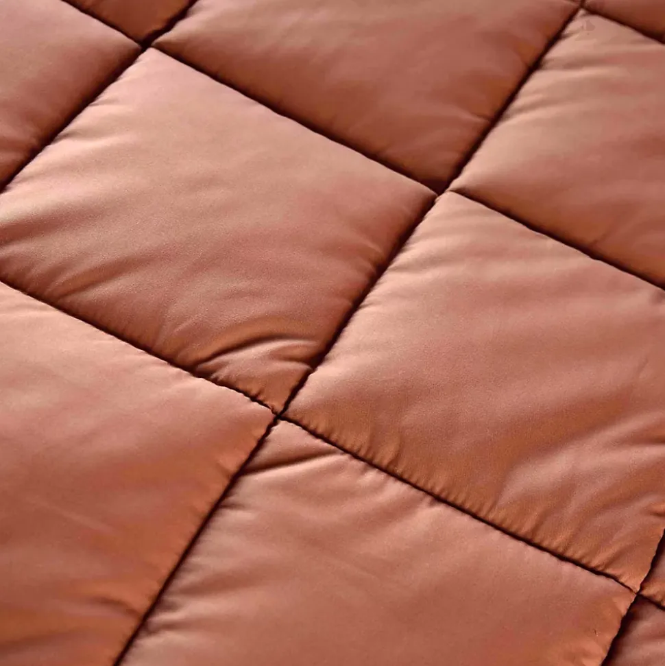 Le dessus de lit LAZY en 100% polyester microfibre effet peau de pêche, avec une finition piquage carreaux et cadre, disponible en orange ocre, vous offrira confort, durabilité et élégance à votre chambre.
