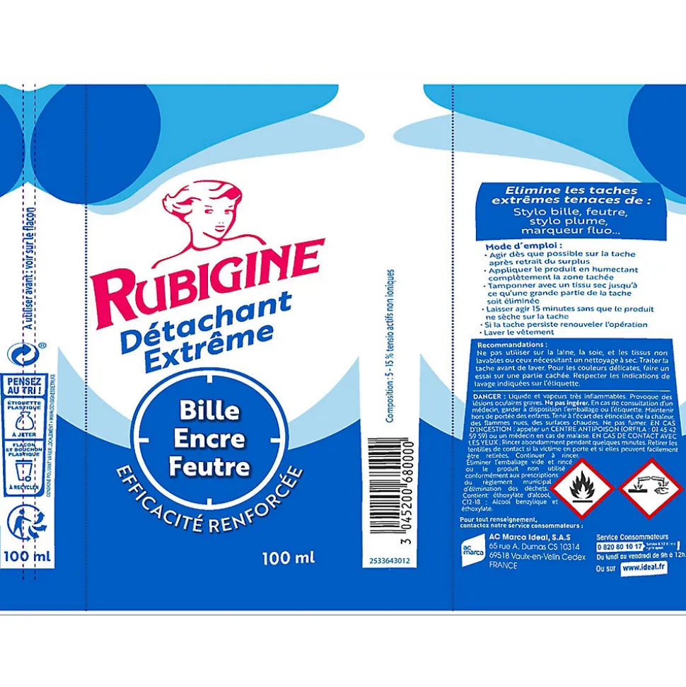 Rubigine – Détachant extrême Bille, Encre, Feutre (100 ml) Élimine efficacement les taches tenaces d’encre, de stylo bille, de feutre, de stylo plume et de marqueur fluo. Formule sans javel, respectueuse des textiles lavables tels que coton, synthétiques, laine et soie. Agit en profondeur sans altérer les fibres. Mode d’emploi : après avoir retiré l’excédent de la tache, imbiber généreusement la zone concernée, humidifier à l’eau chaude, laisser agir quelques instants, frotter légèrement, puis rincer à l’eau tiède. Renouveler l’opération si nécessaire. Pour les couleurs délicates, effectuer un essai préalable sur une partie cachée. Produit fabriqué en France. Contenance : 100 ml.