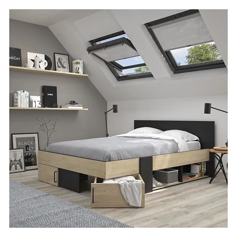 Découvrez notre Lit Rangement 160 X 200 SWIVEL, une fusion de praticité et de style contemporain. Sa structure en panneaux de particules revetus de papier Châtaignier naturel et uni Noir offre une esthétique sophistiquée et une durabilité remarquable. Les chants uni Noir ajoutent une touche d’élégance supplémentaire a son design épuré. Équipé de deux tiroirs a ouverture pivotante en pied de lit, ce lit offre un espace de rangement généreux avec des dimensions pratiques de 45×45 cm chacun. De plus, les deux casiers latéraux avec une séparation offrent une solution de stockage supplémentaire pour garder vos affaires organisées. Les poignées en ABS noir apportent une touche de modernité et de contraste subtil au design. Grâce a sa réversibilité gauche/droite au montage, ce lit s’adapte parfaitement a la configuration de votre espace. Veuillez noter que le sommier et le matelas ne sont pas inclus, vous permettant ainsi de personnaliser votre confort de sommeil selon vos préférences.